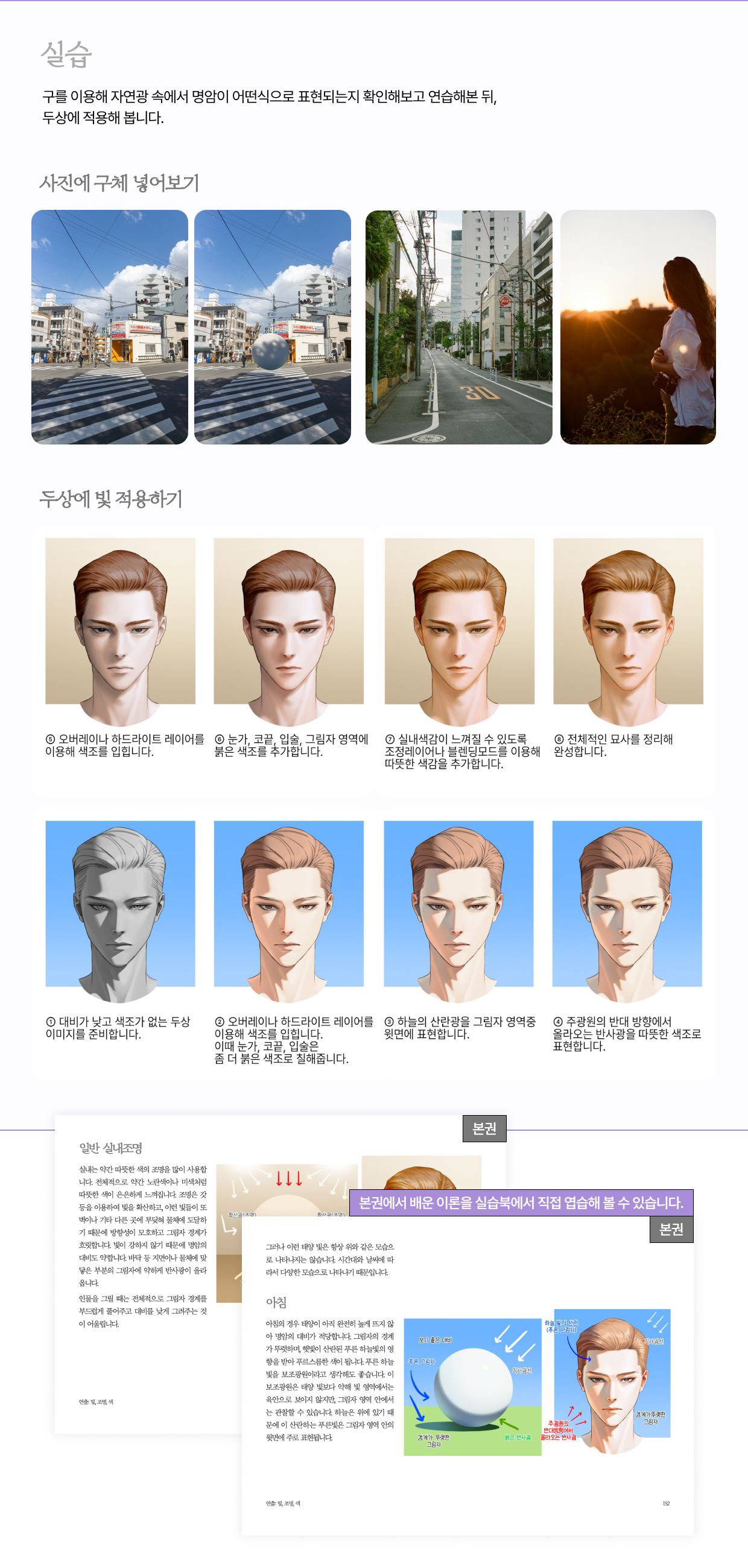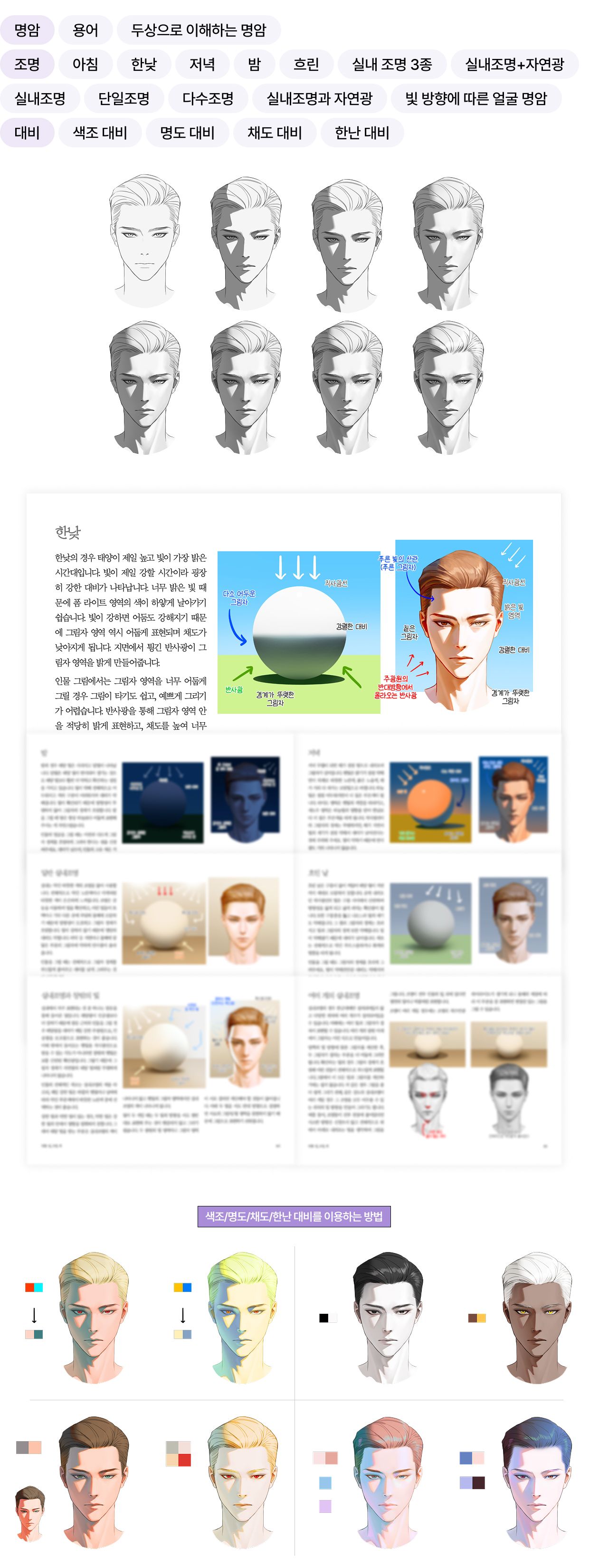 얼굴에서 명암은 어떻게 표현되어야 할까요? 단순히 이론에서 그치지 않고, 실전에서 적용하는 방법을 통해 효과적인 채색을 살펴봅니다. 특히 조명의 종류, 시간대, 날씨, 빛 방향에 따라 어떻게 얼굴에 채색이 다르게 적용되는지를 구체적으로 살펴봅니다. 색, 명도, 채도가 무엇인지 알아도, 어떻게 적용할지는 막막하기 마련이죠. 이들의 대비를 활용하여 일러스트의 차이나는 한끗을 만드는 현업 작가의 노하우를 담아냈습니다.