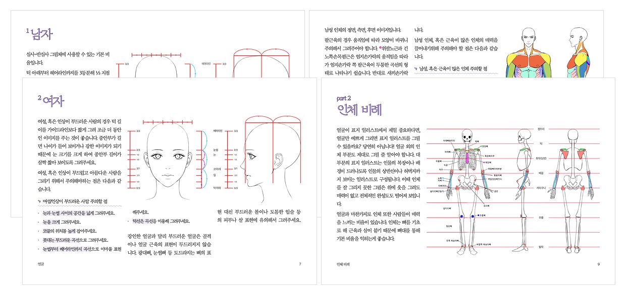 기본도 소홀히하지 않았습니다. 두고두고 어느 그림에나 적용할 수 있도록, 기본 얼굴과 인체 비례 자료도 포함되어 있습니다.