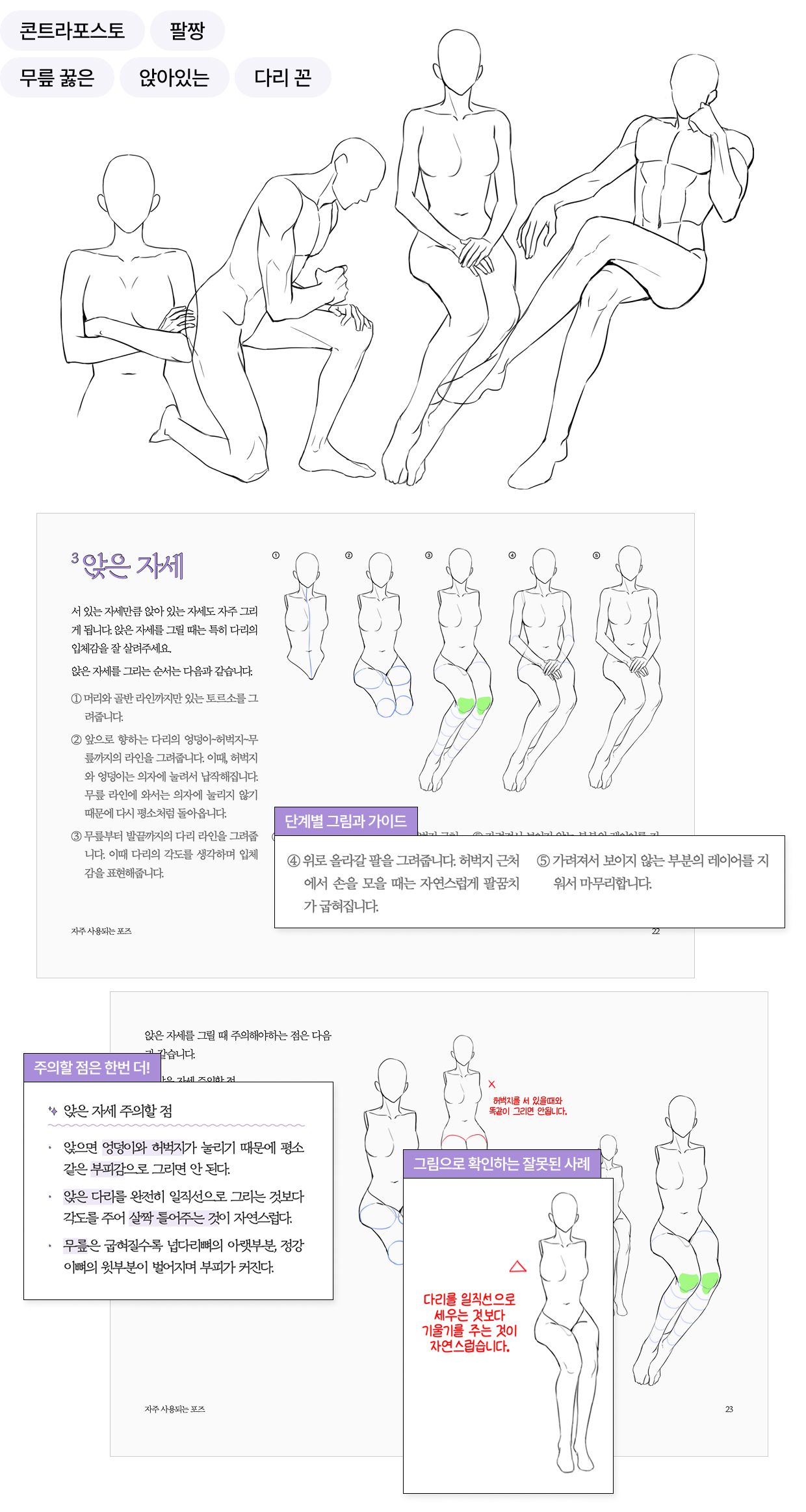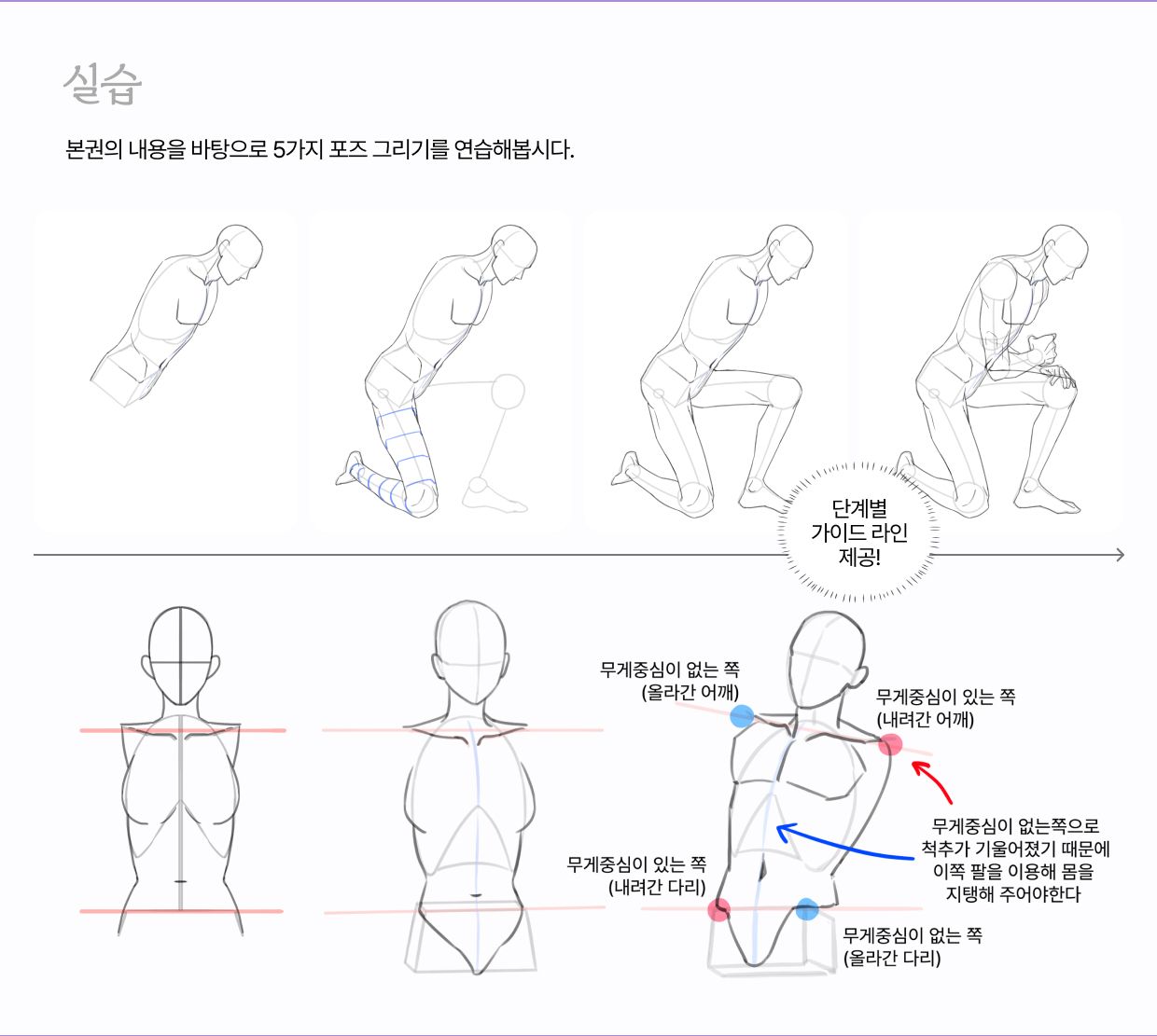 그림 그릴 때 어떤 포즈를 그릴까? 이젠 더 이상 고민하지 마세요. 언제 어디서든 유용하게 사용할 수 있는 5개의 포즈를 단계별로 설명합니다. 해당 포즈를 그릴 때 자주 실수하는 부분, 주의해야 할 점도 코바 선생님이 그림과 함께 쏙쏙 짚어줍니다.