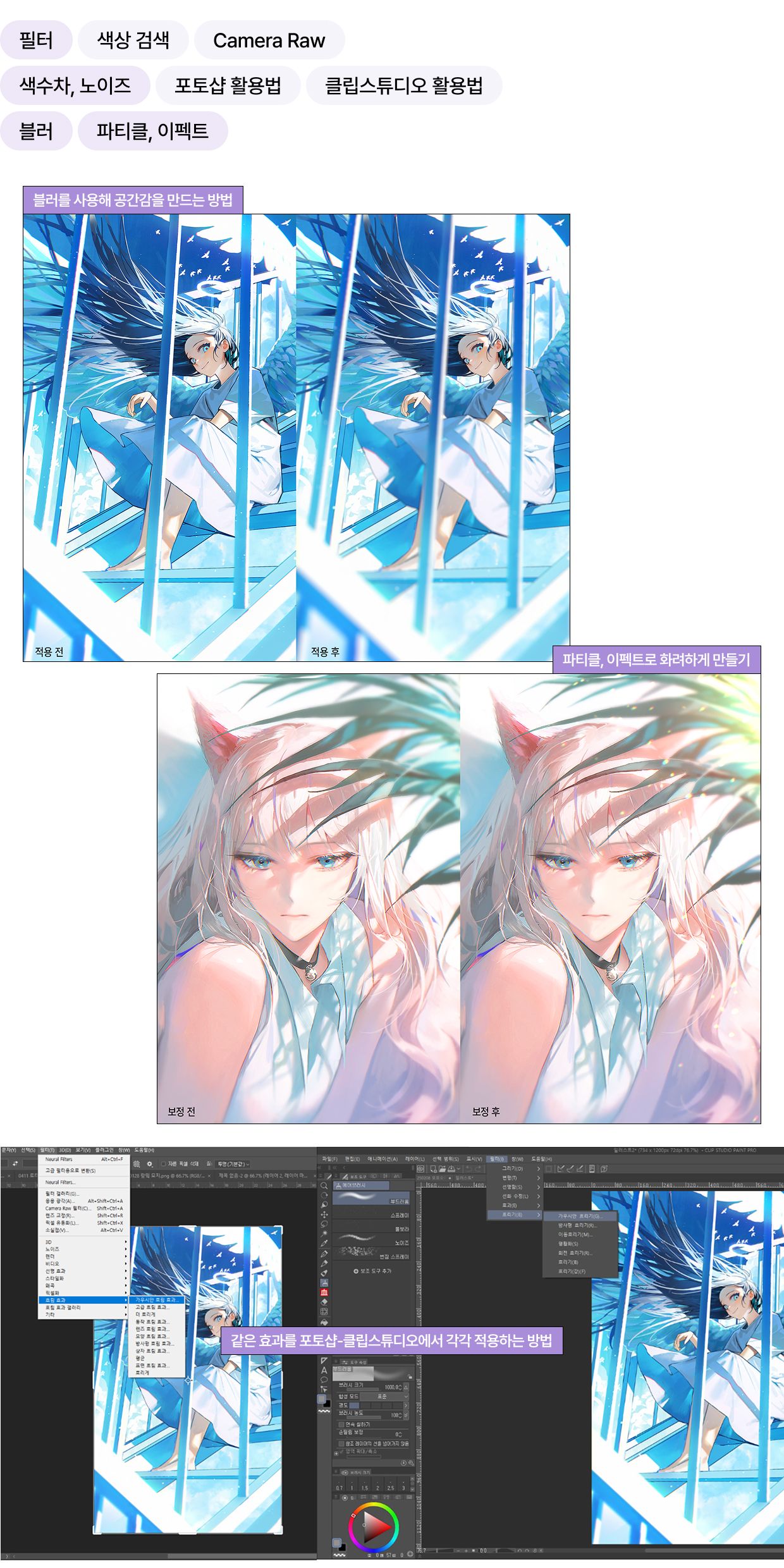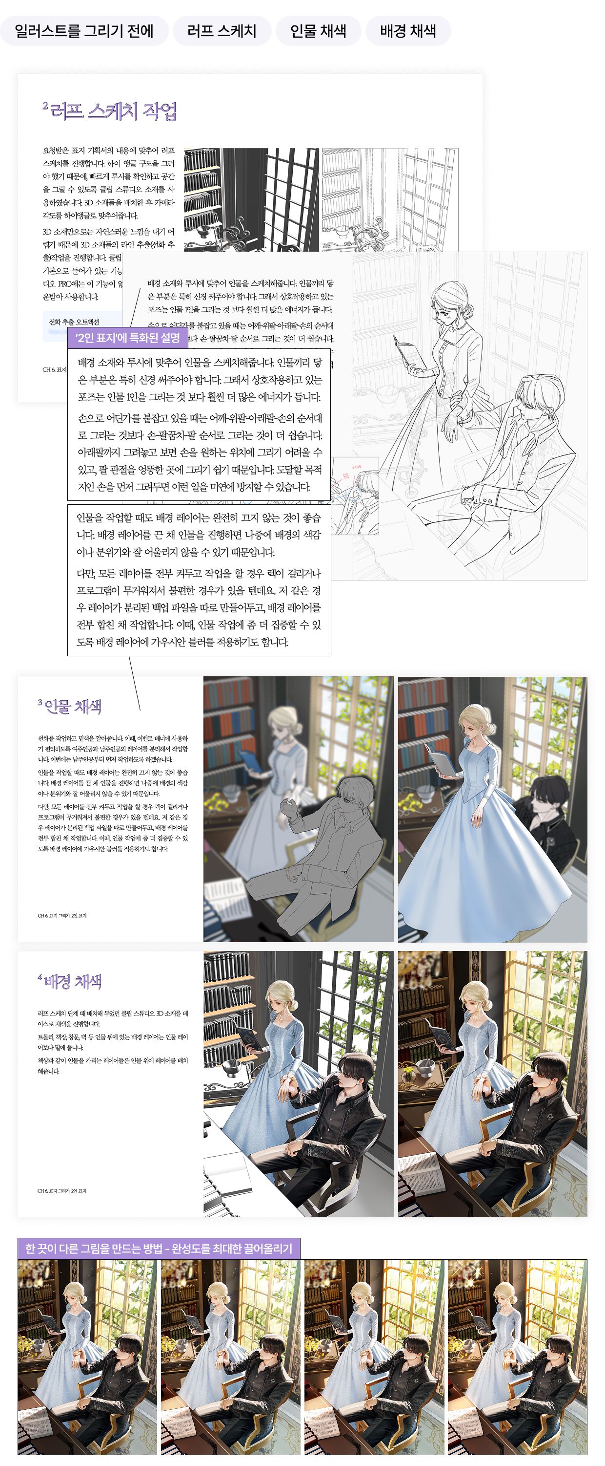 그림의 마무리와 완성, 보정을 하는 방법을 살펴봅시다. 어딘가 그림이 허전하게 느껴졌다면, 그림의 퀄리티를 한 단계 높이고 싶다면 결코 놓칠 수 없는 파트죠. 단계별로 하나씩 설명해 프로그램 활용법까지 충분히 익힐 수 있도록 담아냈습니다.