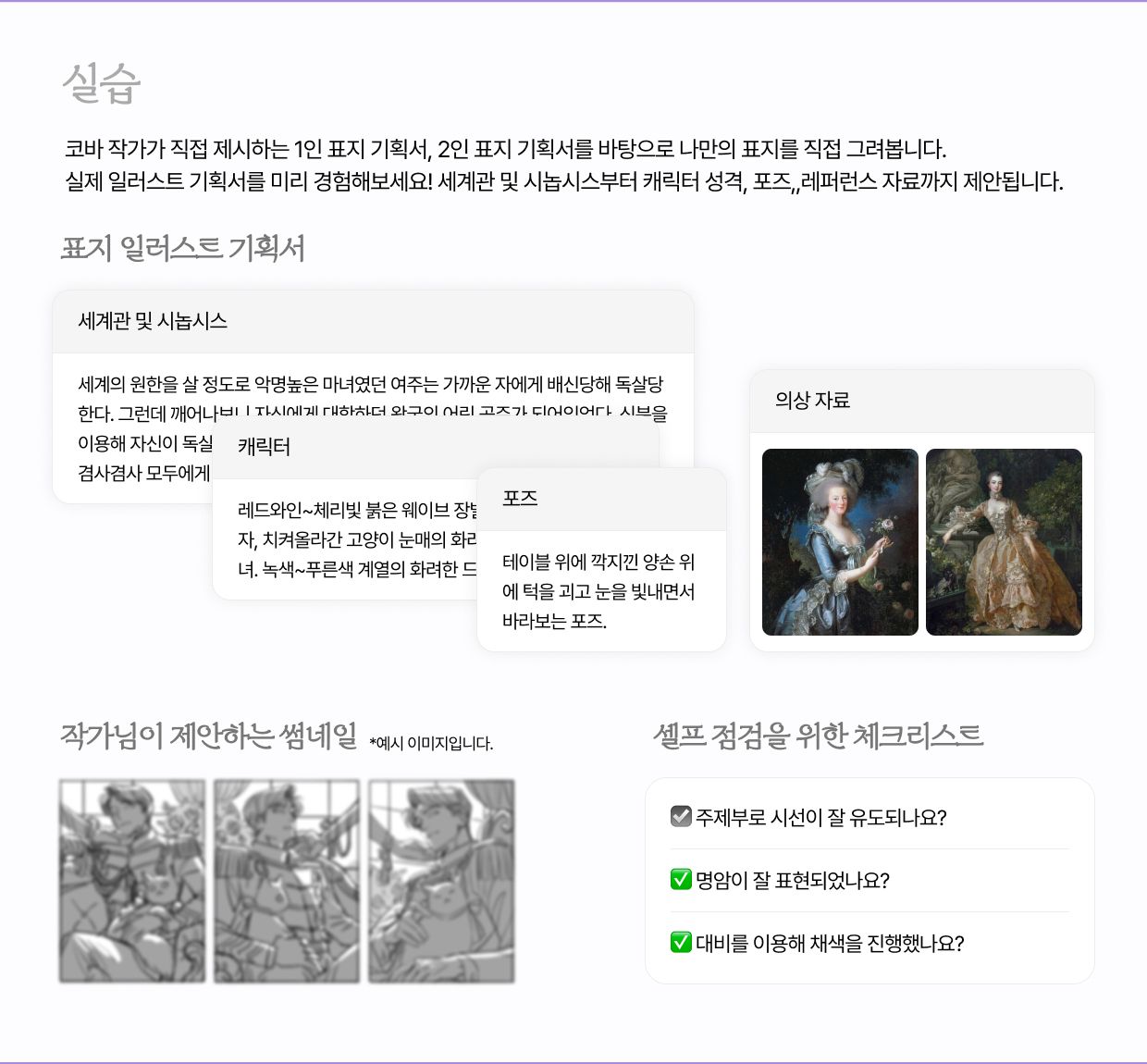 어떻게 시선을 집중시킬지를 코바의 예시작과 함께 살펴볼 수 있도록 준비했습니다. 그림의 완성도를 올리는 다양한 방법을 소개하는 챕터이니 기대해주세요.
