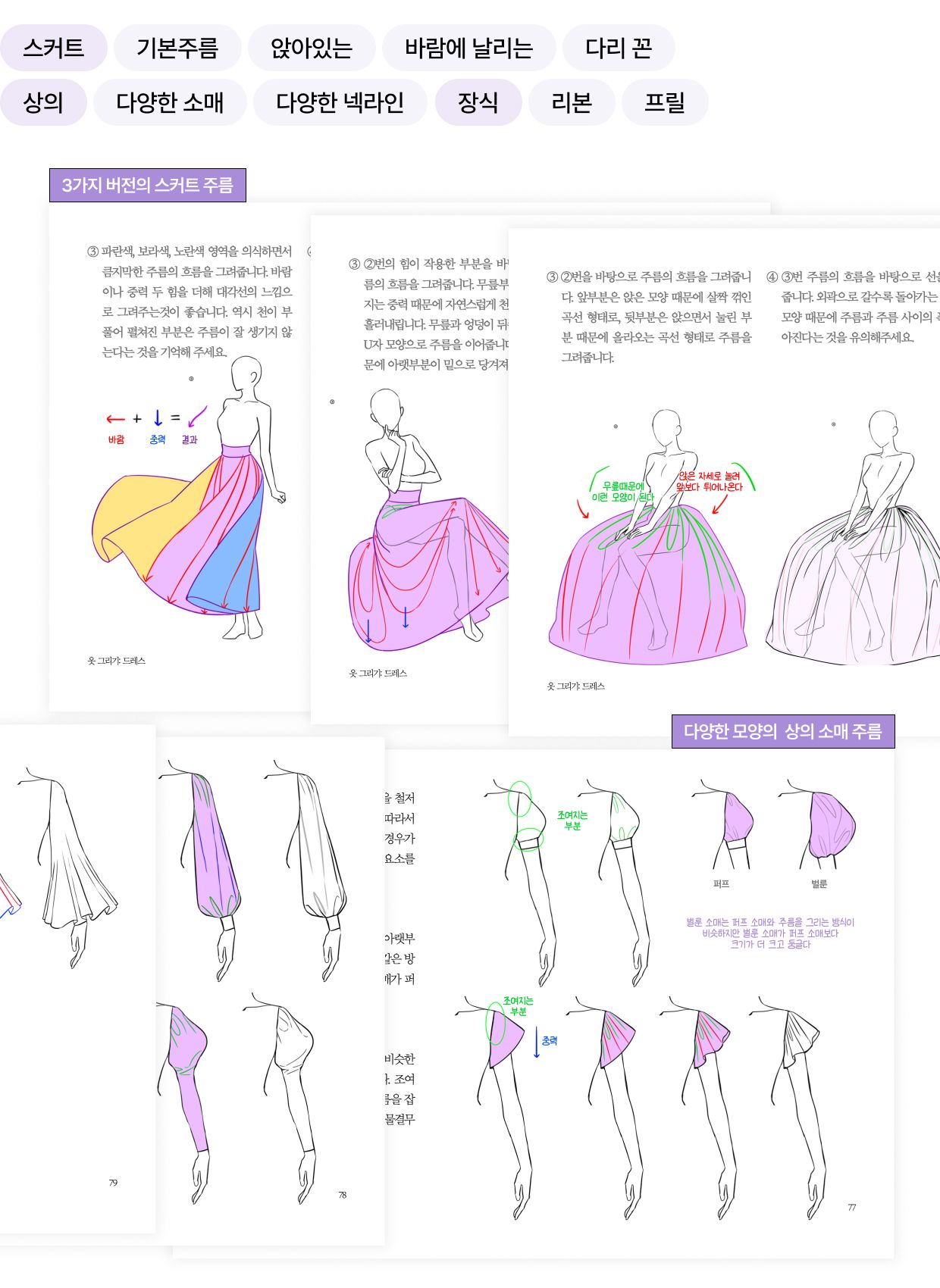 다양한 소매와 넥라인의 종류(그림+명칭)도 담아 작업할 때 참고할 수 있도록 정리했습니다. 이제 더 이상 어떤 의상을 그릴지 고민할 필요가 없겠죠. 프릴과 리본 같은 디테일을 묘사하는 법도 단계별로 정리하여 완성도를 높일 수 있도록 구성했습니다.