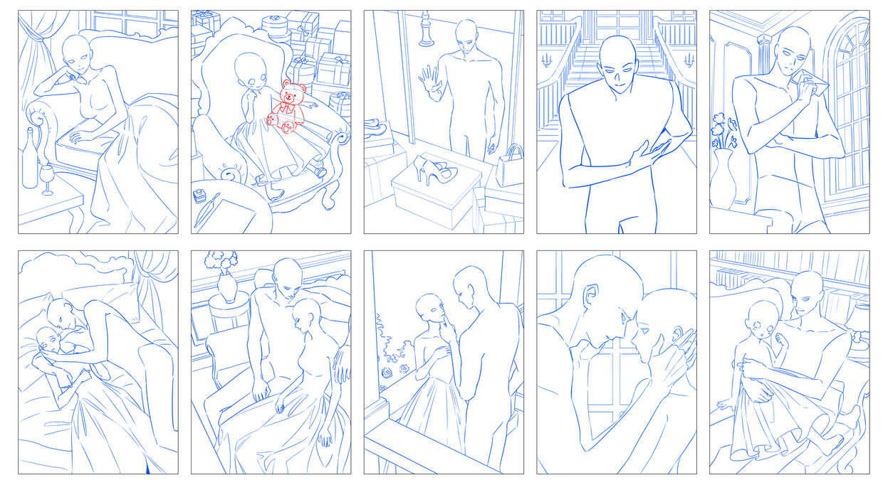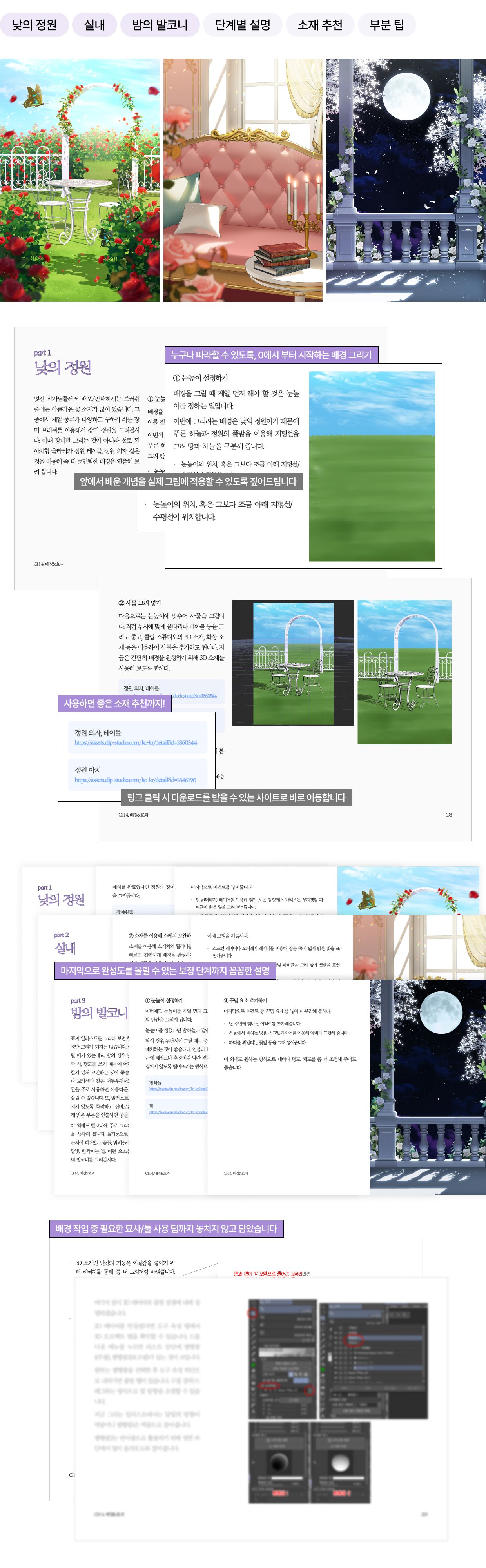 연출 파트에서 배운 내용을 바탕으로, 로판에서 자주 사용하는 세 가지 배경을 함께 그려봅니다. 낮의 야외 정원, 실내, 밤의 발코니를 그려볼텐데요. 하나의 배경을 완성하는 방법을 실제 작가의 작업 과정을 따라가며 배우고, 디테일을 살리는 실전 팁을 얻을 수 있습니다.