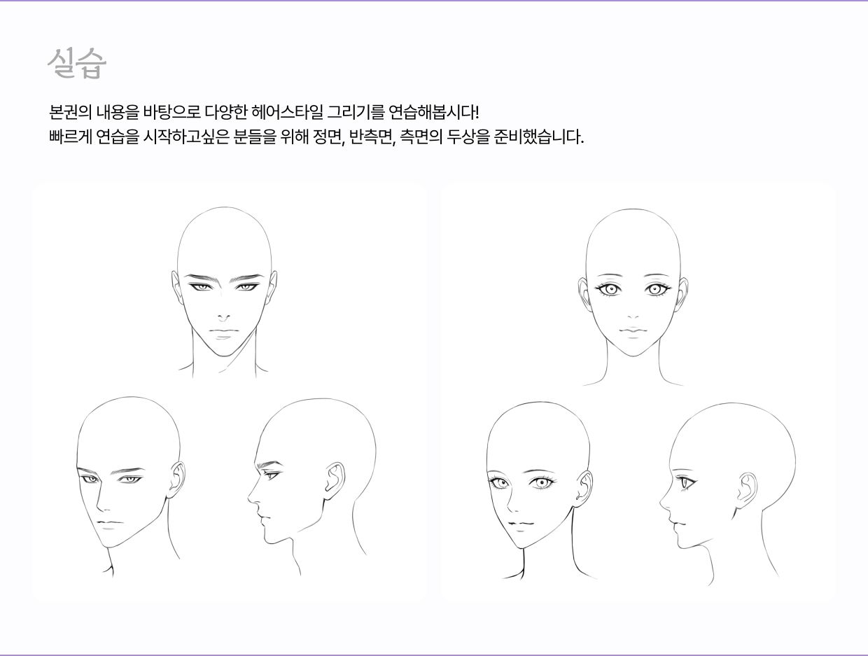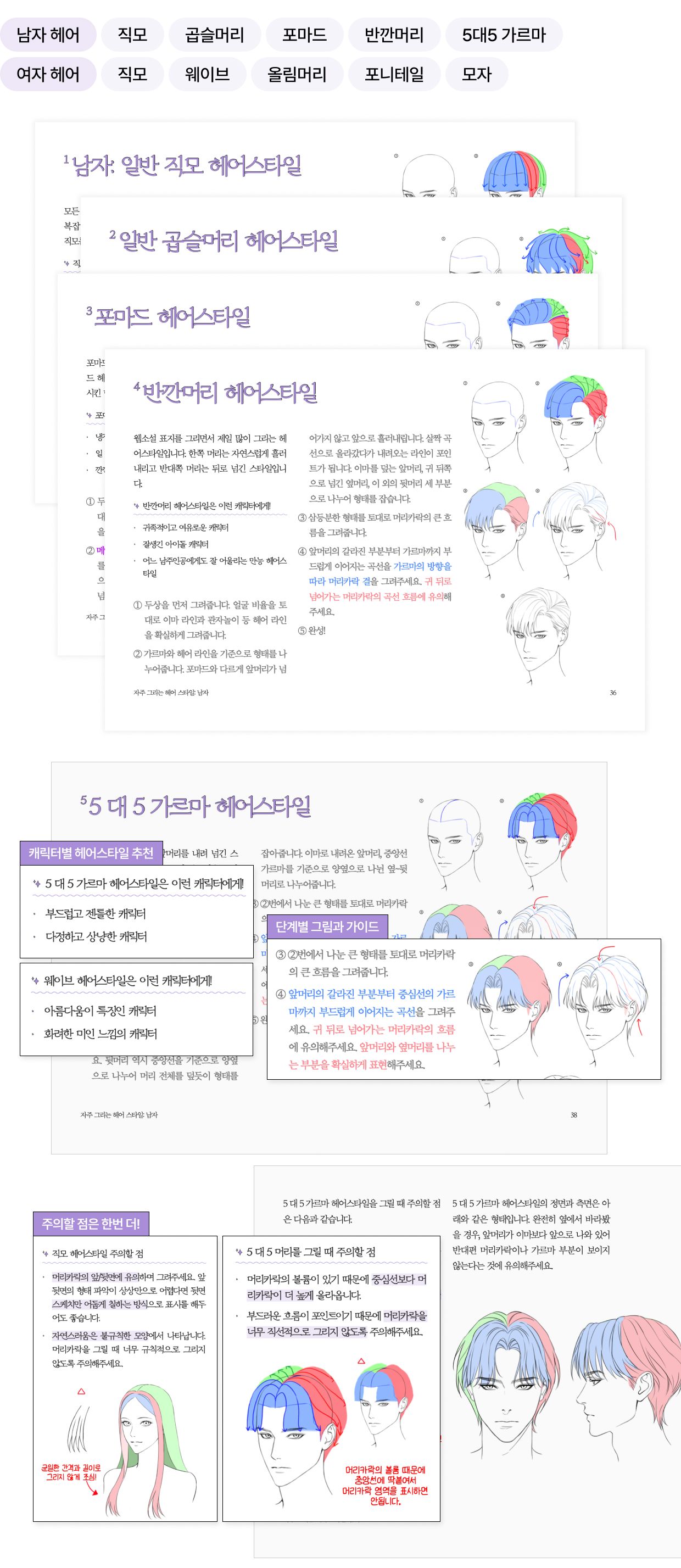 성별에 따라 자주 그리는 헤어스타일을 추려 단계별로 그리는 방법을 정리했습니다. 웹소설 표지는 물론이고, 모든 드로잉 작업에 사용할만한 대부분의 스타일을 담아냈어요. 어떤 캐릭터에게 어울리는 헤어스타일인지, 자주 실수하는 부분은 무엇인지 그림과 함께 쉽게 확인할 수 있습니다.