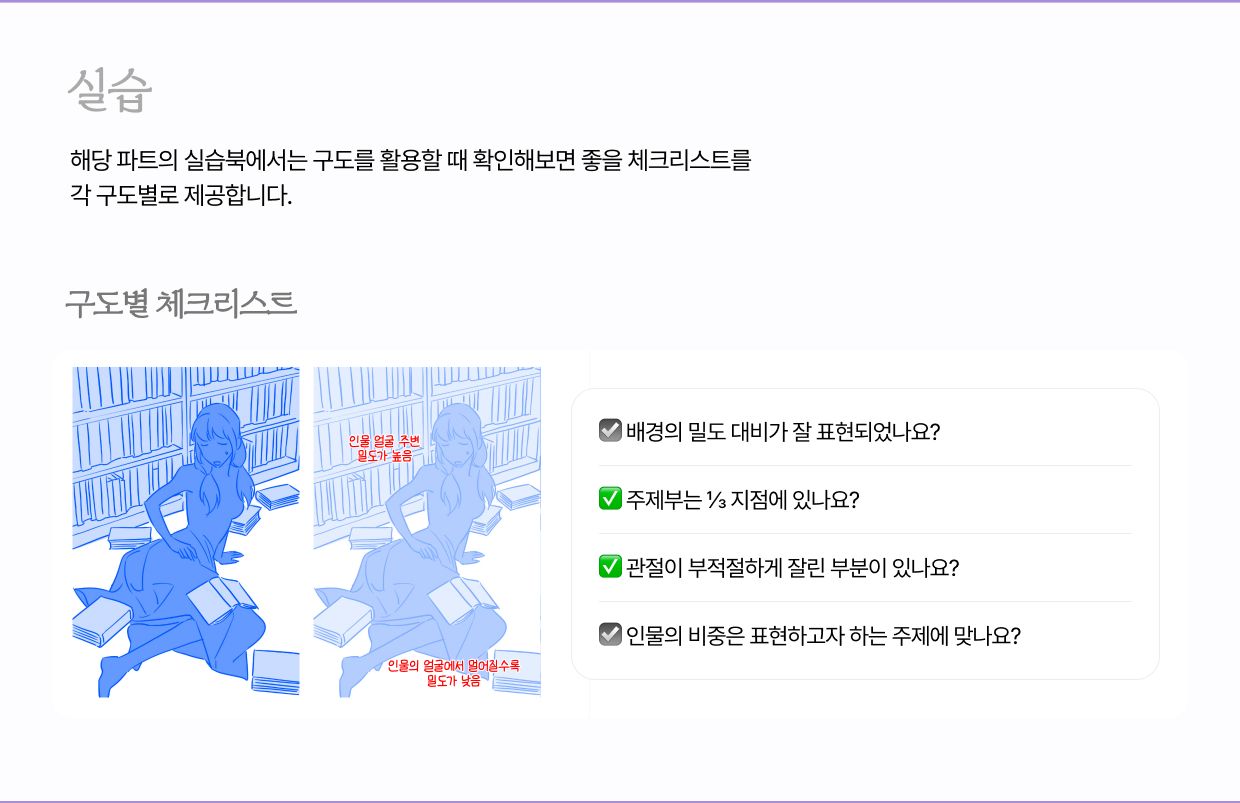 🟣 실습북은 본권에서 배운 내용을 놓치지 않도록, 직접 연습할 수 있는 콘텐츠로 구성했습니다. 본권에서 배운 내용 뿐만 아니라, 추가 자료를 통해 '제대로 그릴 수 있도록' 만들었습니다. 코바 작가님의 예시와 설명을 통해 내가 제대로 실습하고 있는지 확인할 수 있어요. 본권에서 다룬 내용이지만 더 차근히, 더 쉽게, 새로운 예시로 살펴볼 수 있어 복습 효과가 톡톡히 있답니다!