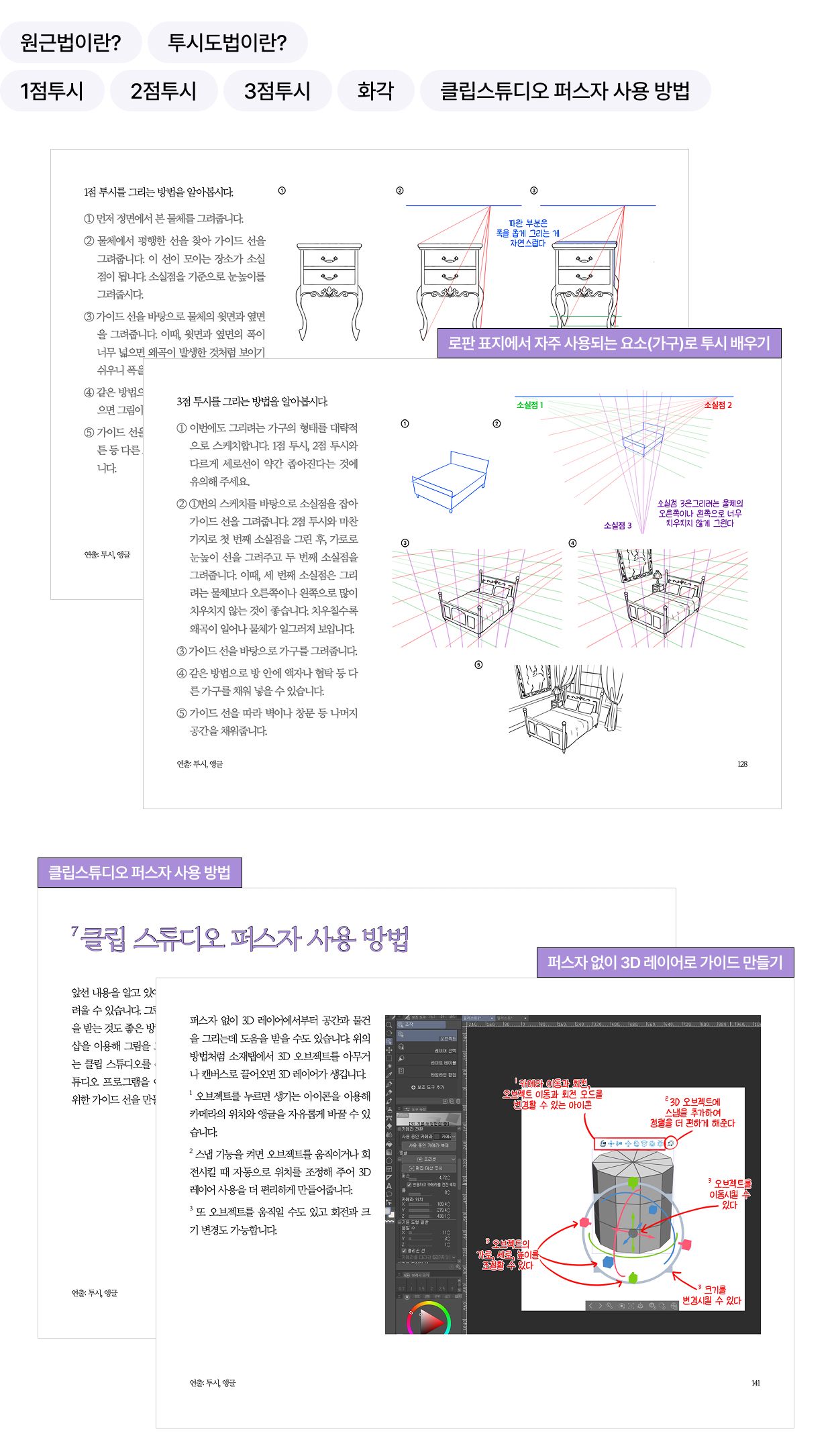 복잡하고 원론적인 투시 설명은 그만! 구체적인 예시와 함께 꼭 알아야 할 투시, 앵글을 설명합니다. 단순히 정확한 그림을 그리는 것을 넘어, 투시와 앵글에 따라 만들어지는 효과를 함께 살펴볼 수 있는데요. 클립스튜디오를 통해서 손쉽게 투시 가이드선을 만드는 방법까지 담았습니다.
