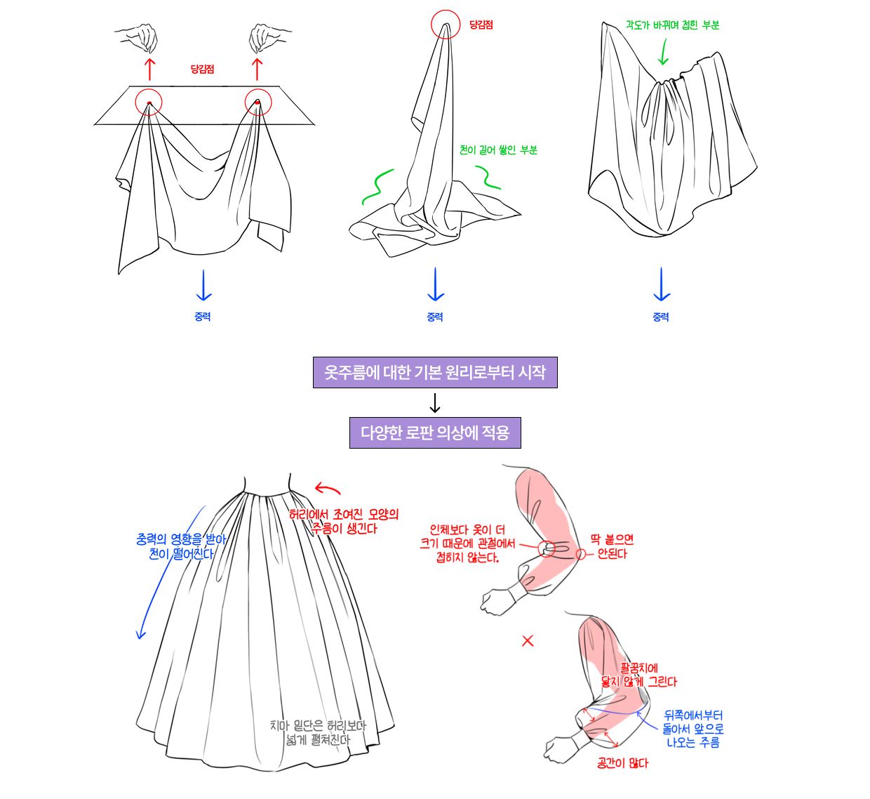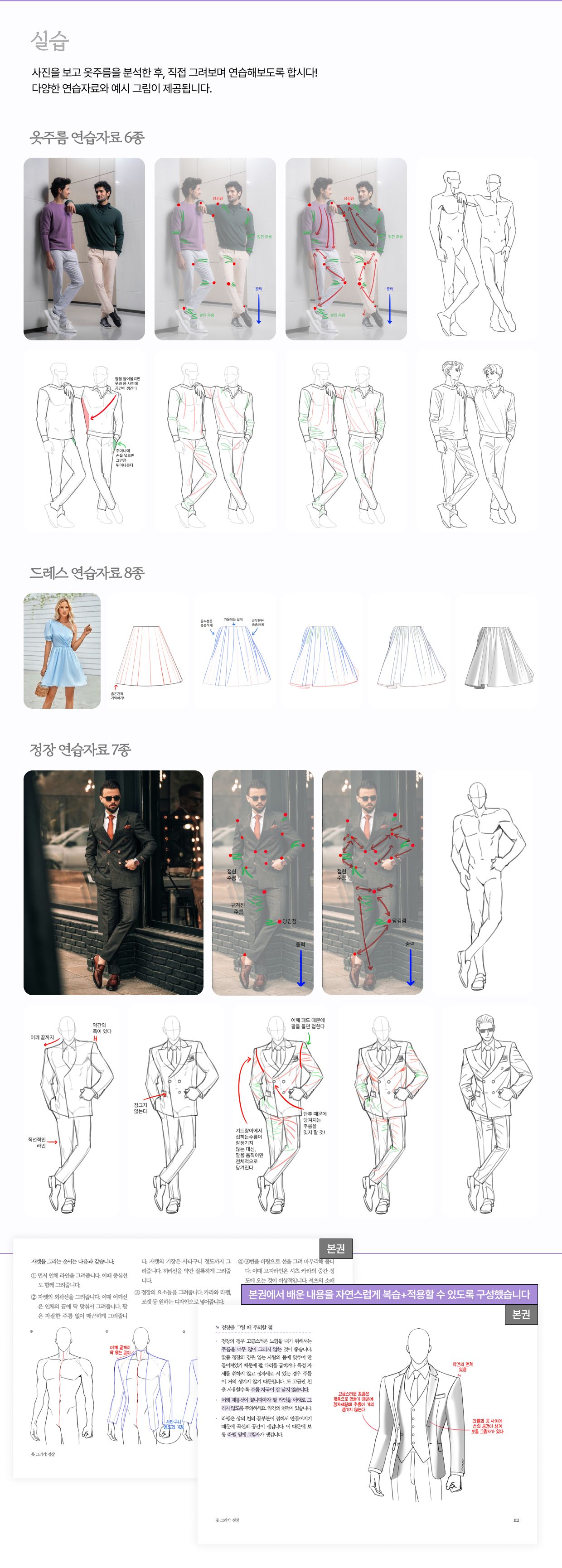 옷을 제대로 그리기 위해서는 먼저 옷 주름에 대한 이해가 필수적인데요. 옷주름이 어색하면 아무리 화려한 의상을 그려도 이상하게 느껴지기 때문입니다. 단순히 외워서 그림을 그리지 않고, 어느 옷에서나 적용할 수 있도록. 옷주름이 어떤 방식으로 생기는지, 이를 어떻게 표현해야 하는지 친절하게 그림으로 설명합니다.