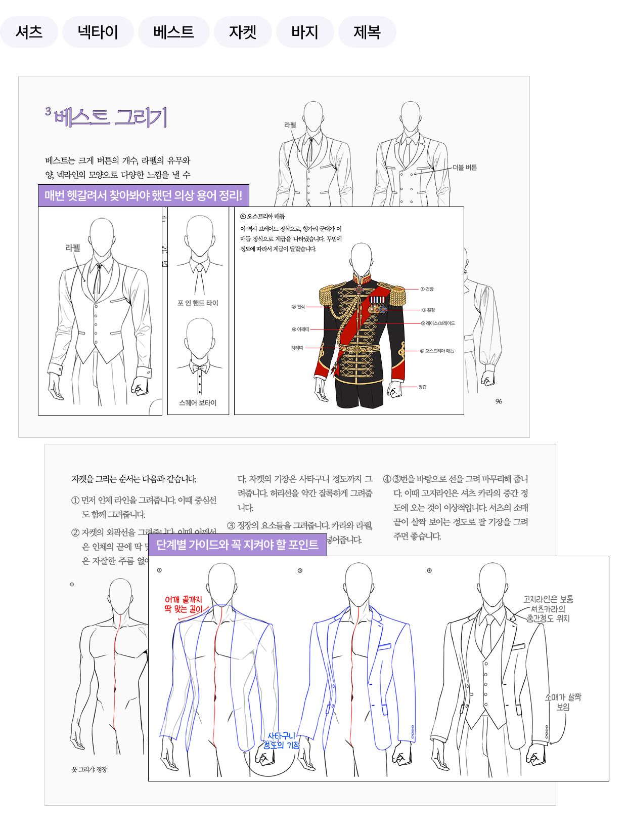정장의 경우 소매, 넥타이, 카라의 종류를 모두 정리해두었습니다. 베스트와 자켓, 바지를 그릴 때 주의해야 할 점과 단계별 설명도 함께 담았는데요. ‘정장을 어떤 스타일로 그릴지 고민될 때 참고하는 자료집’과 ‘어떻게 정장을 그려야 할지 어려울 때 참고하는 가이드북’의 역할을 동시에 해주는 파트입니다.