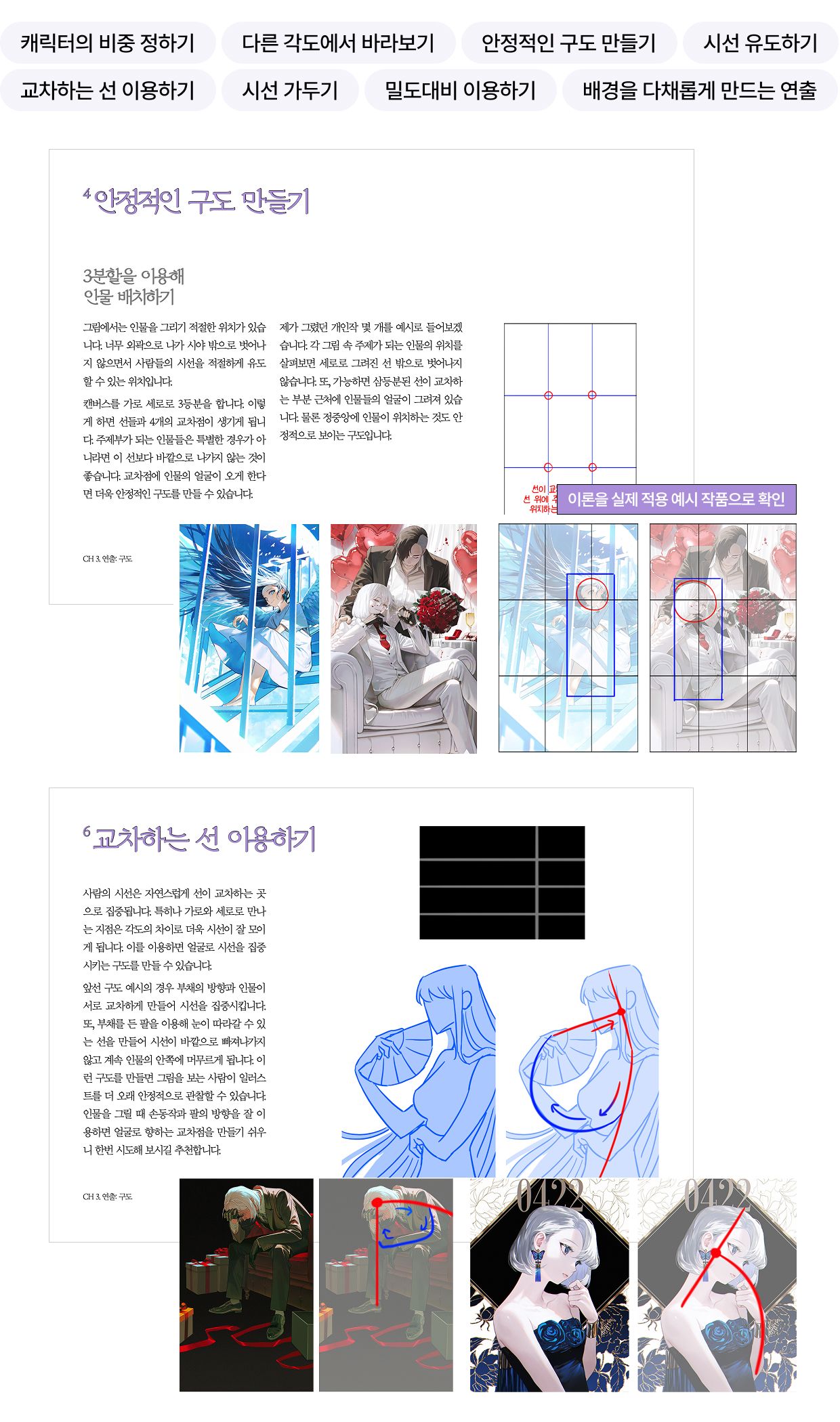 쉽고 간단하게 다양한 구도를 잡아보는 방법을 소개합니다. 각 구도의 효과를 설명해 활용할 수 있도록 도움을 줄 뿐만 아니라, 같은 그림을 다른 구도로 배치해보며 가장 나은 구도를 찾아가는 과정을 보여줍니다.