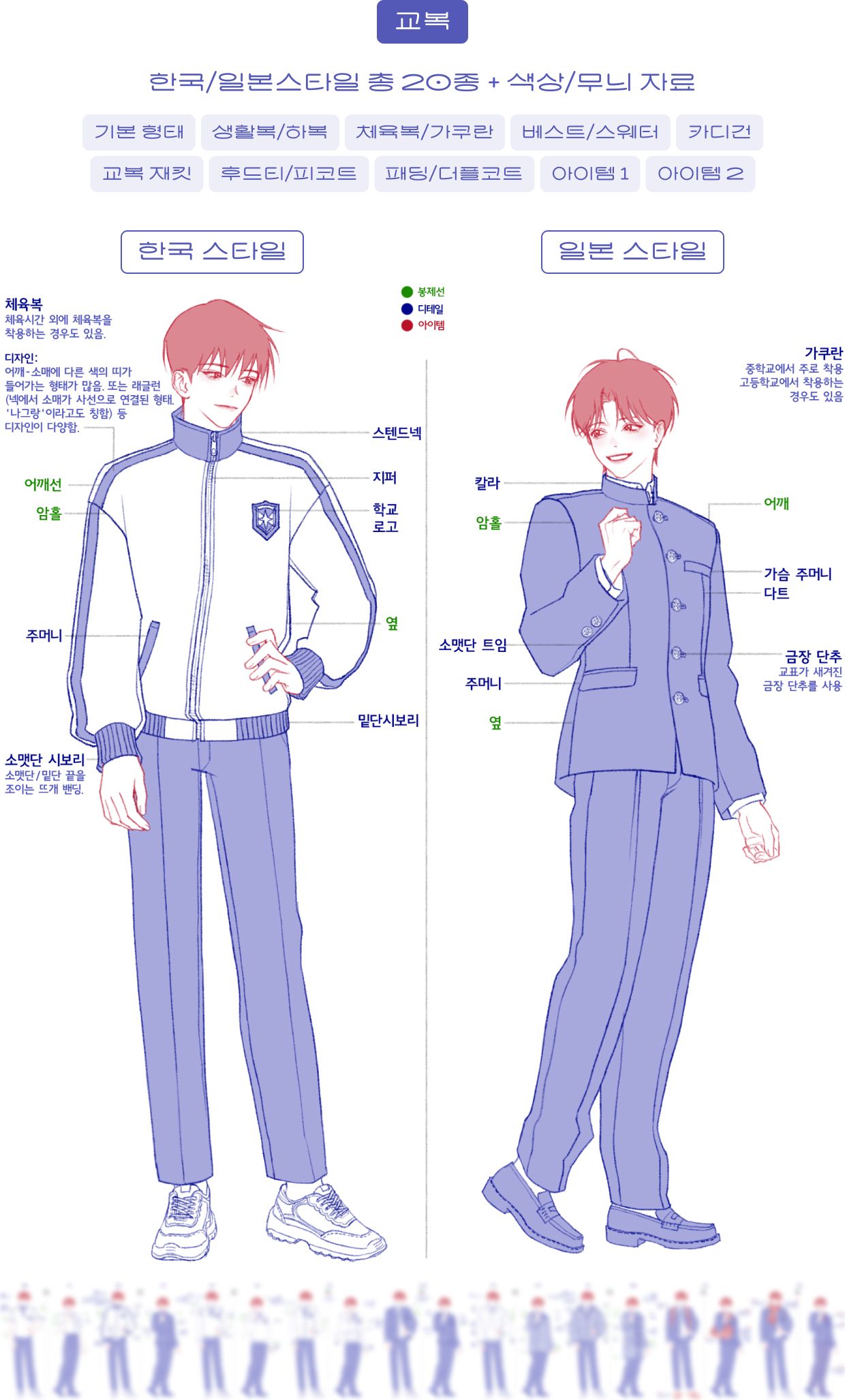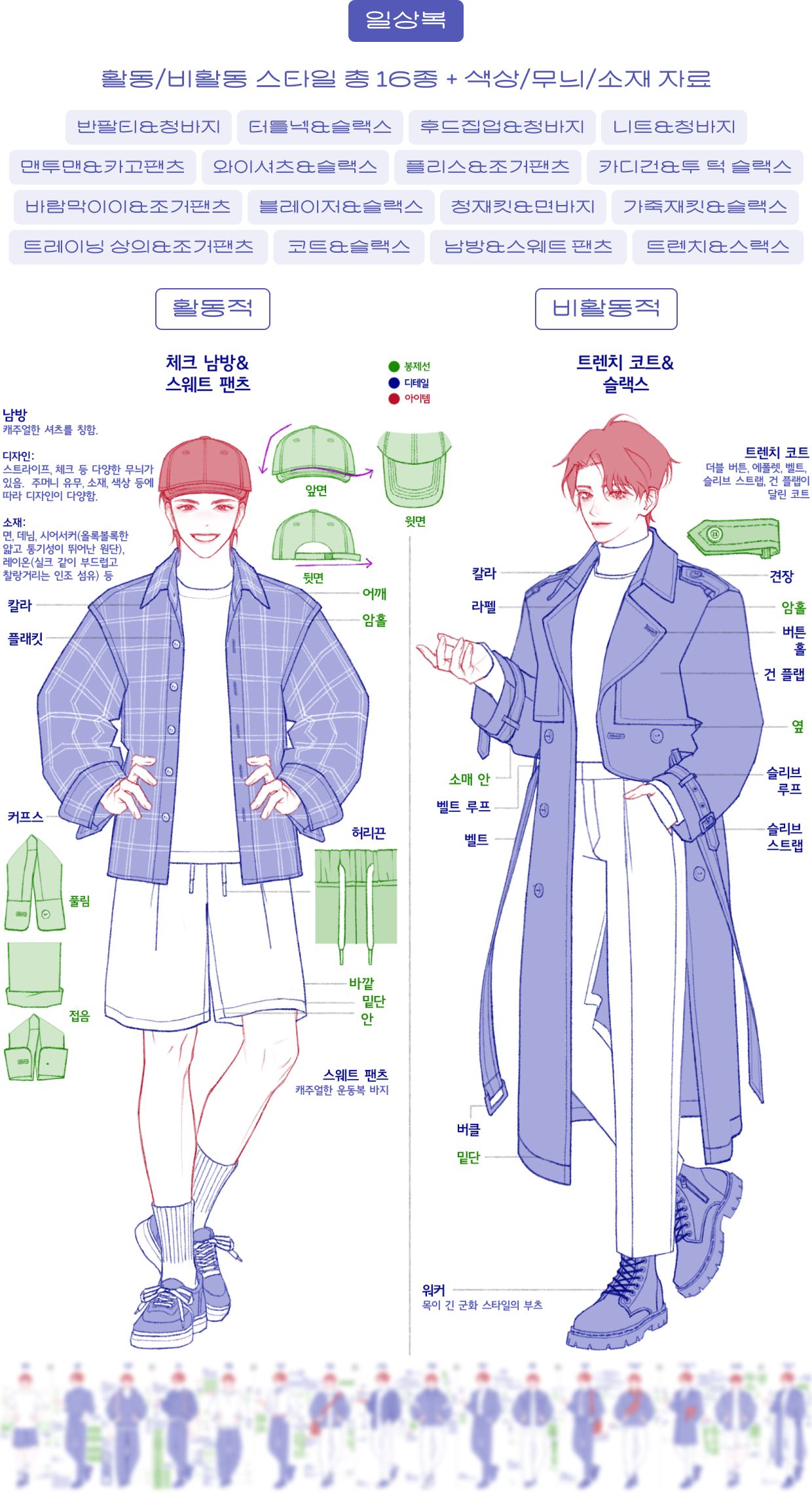 교복과 일상복은 물론, 많이 그리는 정장이나 예복까지. 심지어는 판타지물에 나오는 헌터나 북부대공의 의상까지 담아냈어요. 단순히 그림을 그리는 법을 넘어, 무엇을 그려야하는지에 대한 자료까지 한번에 준비되어있답니다.