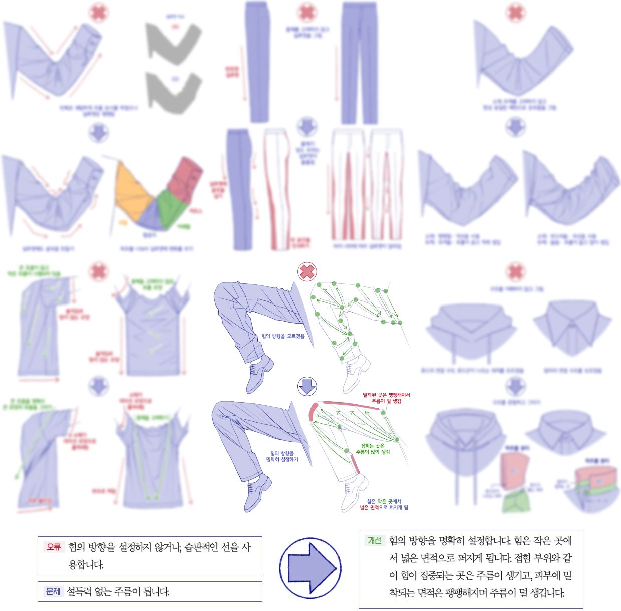 더 나아가 실루엣, 힘의 방향, 소재와 두께, 형태 등의 챕터를 구성해 어색한 옷주름을 보다 자연스럽게 그릴 수 있도록 비교하는 6가지 디테일 파트를 준비했습니다.