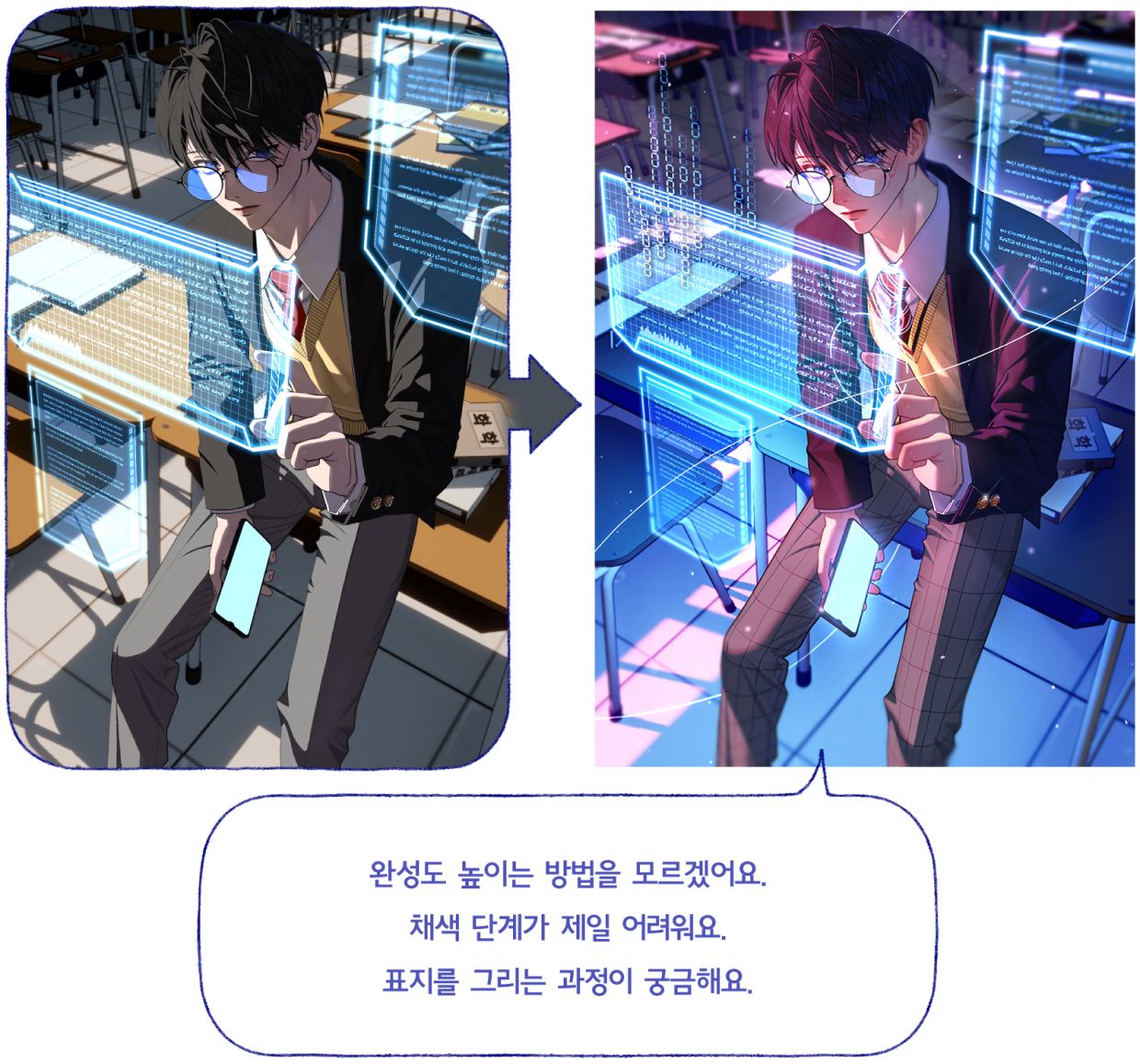 그림의 완성도를 올리고 채색에 집중해보는 파트입니다. 지금까지 배운 그림팁을 바탕으로 완성된 상업 표지를 그리는 법을 살펴볼거예요.