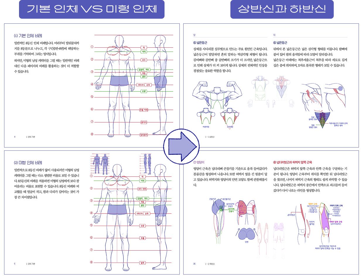 일반적인 8등신 인체 비례를 사용하면 미형 남캐에게는 다소 평범해보일 수 있습니다. 기본적인 인체 구조를 살펴봄과 동시에, 더 매력적인 남캐를 위해 꼭 숙지해야 할 부분을 담아내 실전에 활용할 수 있도록 했습니다. 인체의 주요한 근육과 뼈를 중심으로 타고 내려가며 상반신과 하반신을 그리는 방법을 설명합니다. 전체의 비례를 단순히 제시하는 것에서 넘어, 각 부분별로 주의할 점이나 기억해야 할 점을 정리했는데요. 내가 그림을 그리다가도 언제든지 살펴보며 디테일을 살릴 수 있도록, 일러스트 연습의 좋은 교보재가 되도록 구성했습니다.