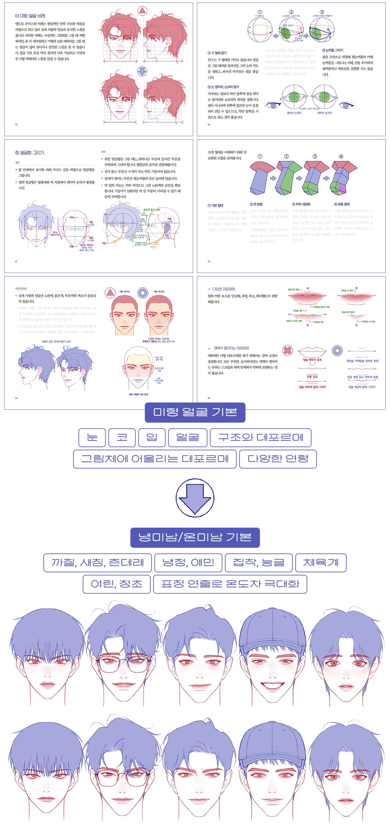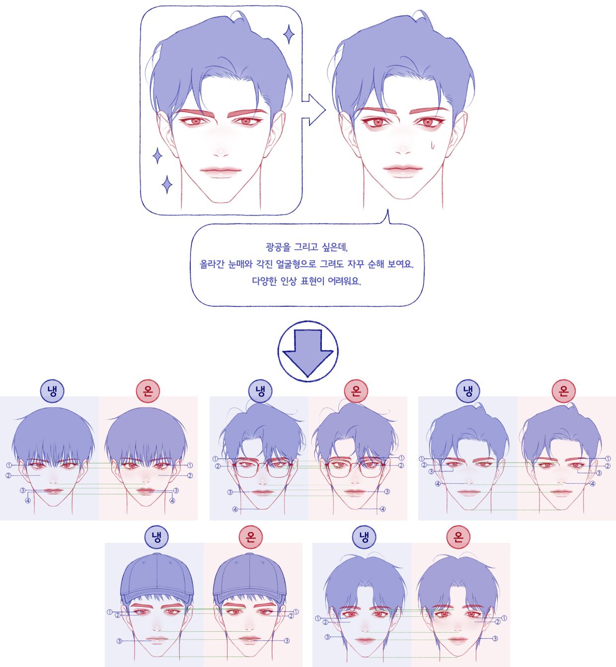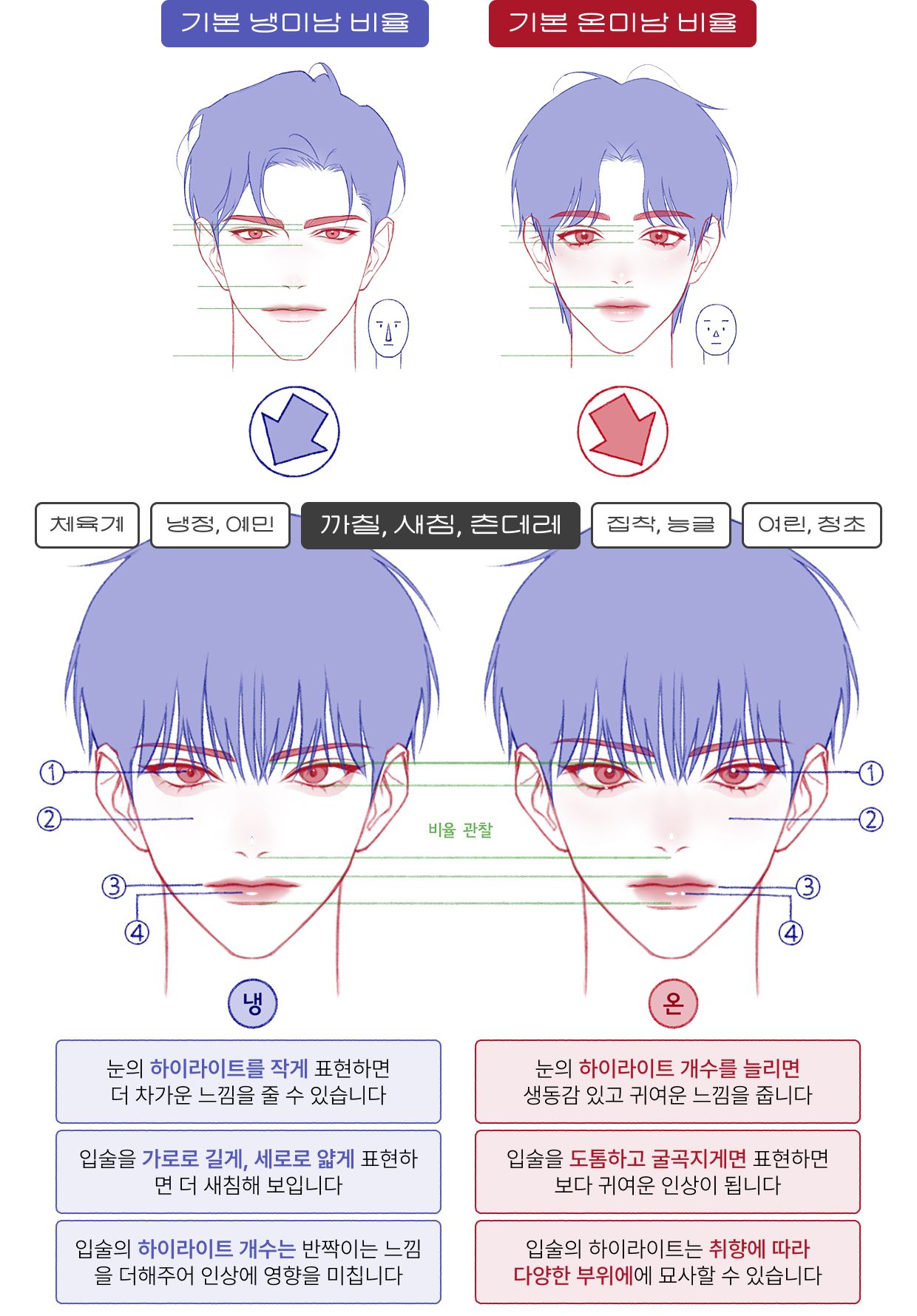 ✌️ 냉미남과 온미남의 두 가지 구분법을 바탕으로 까칠, 예민, 능글, 체육계, 청초 등등… 다양한 얼굴상 표현을 배워봅니다.