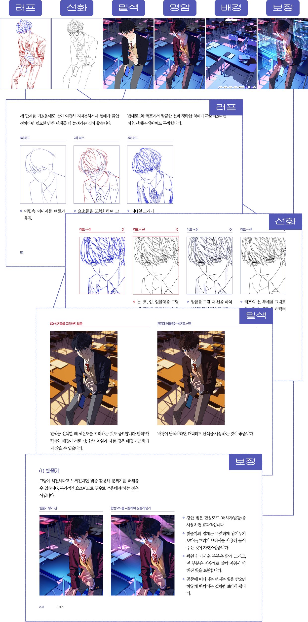 러프, 선화, 밑색을 거쳐 명암과 배경, 보정까지. 하나의 캐릭터를 채색하는 과정을 따라가며 주의할 점을 살펴봅시다. 특히 앞에서 배운 내용들이 한장의 그림을 완성할 때 어떻게 적용되는지를 확인할 수 있는 중요한 파트입니다.
