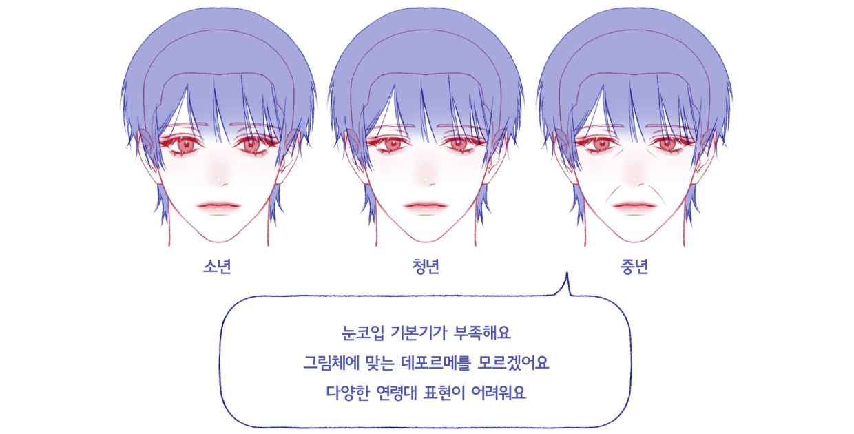최근에는 20-40대의 무난한 남캐를 넘어, 보다 다양한 성격과 나이를 가진 캐릭터가 인기입니다. 특히 광공, 예민남, 아이, 중년캐 등등… 매력적이고 감초같은 캐릭터를 그리는 방법도 익힐 필요가 있는데요.
