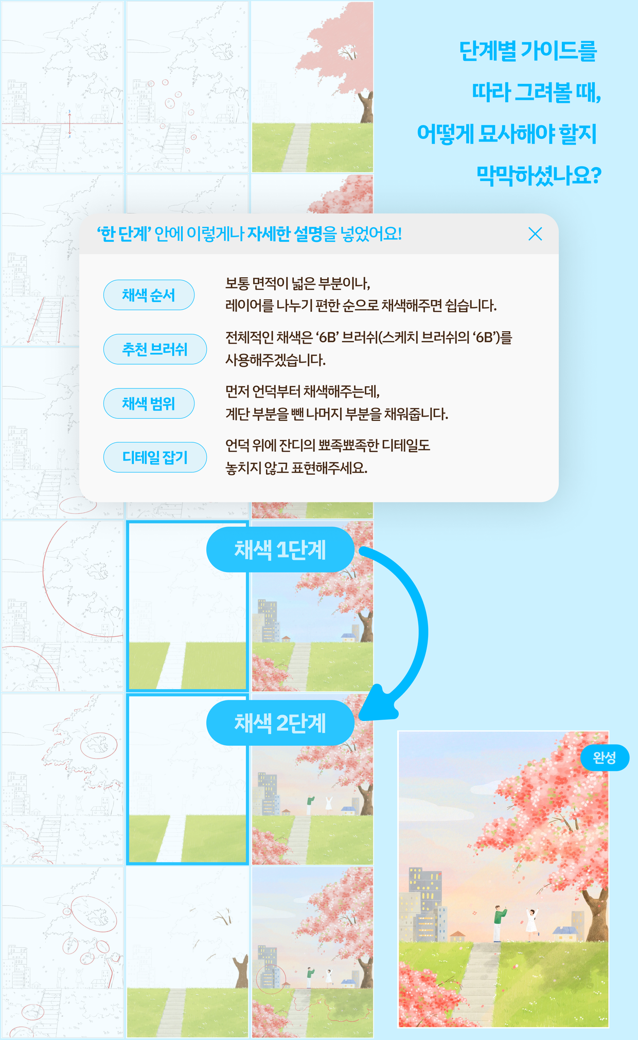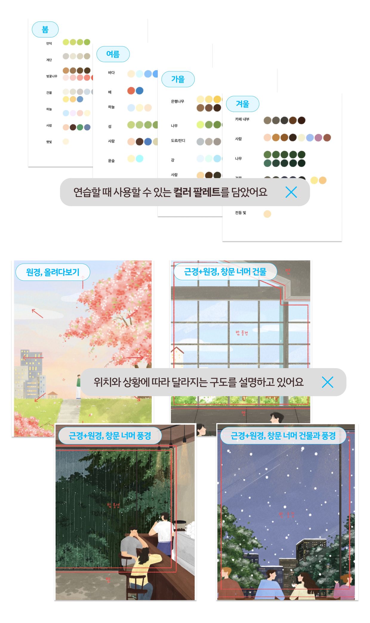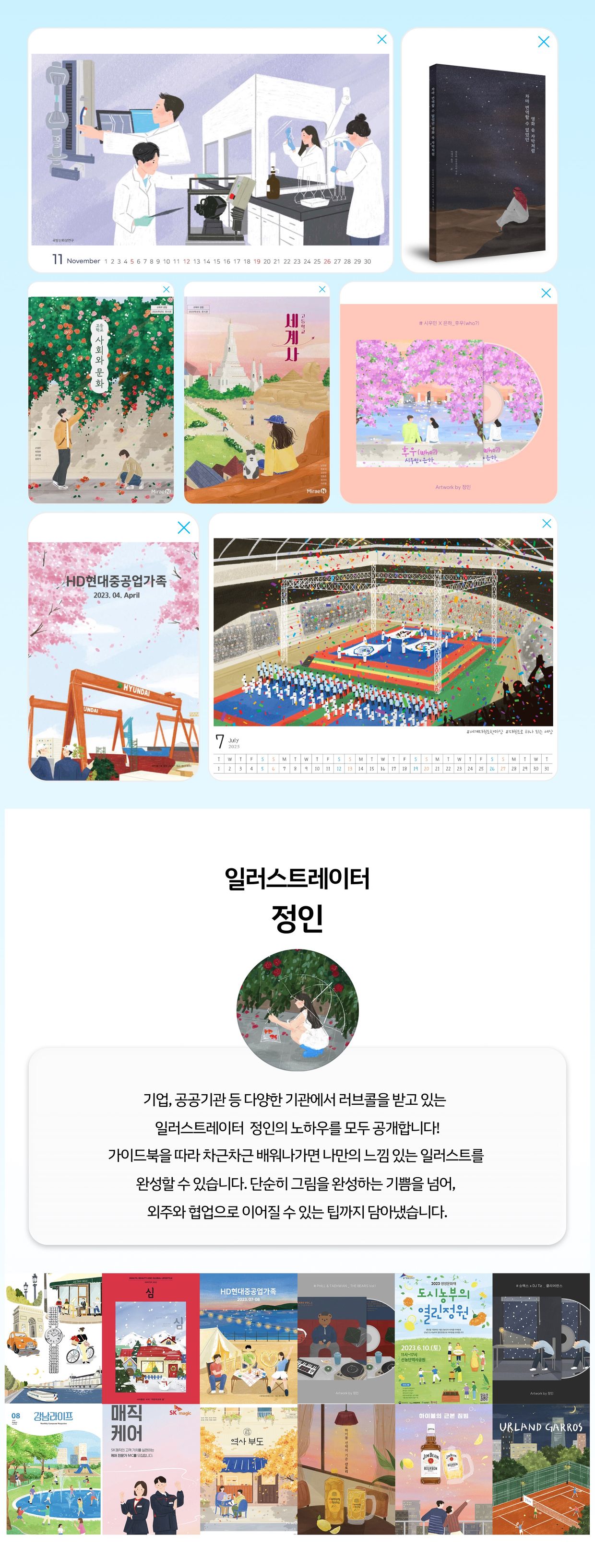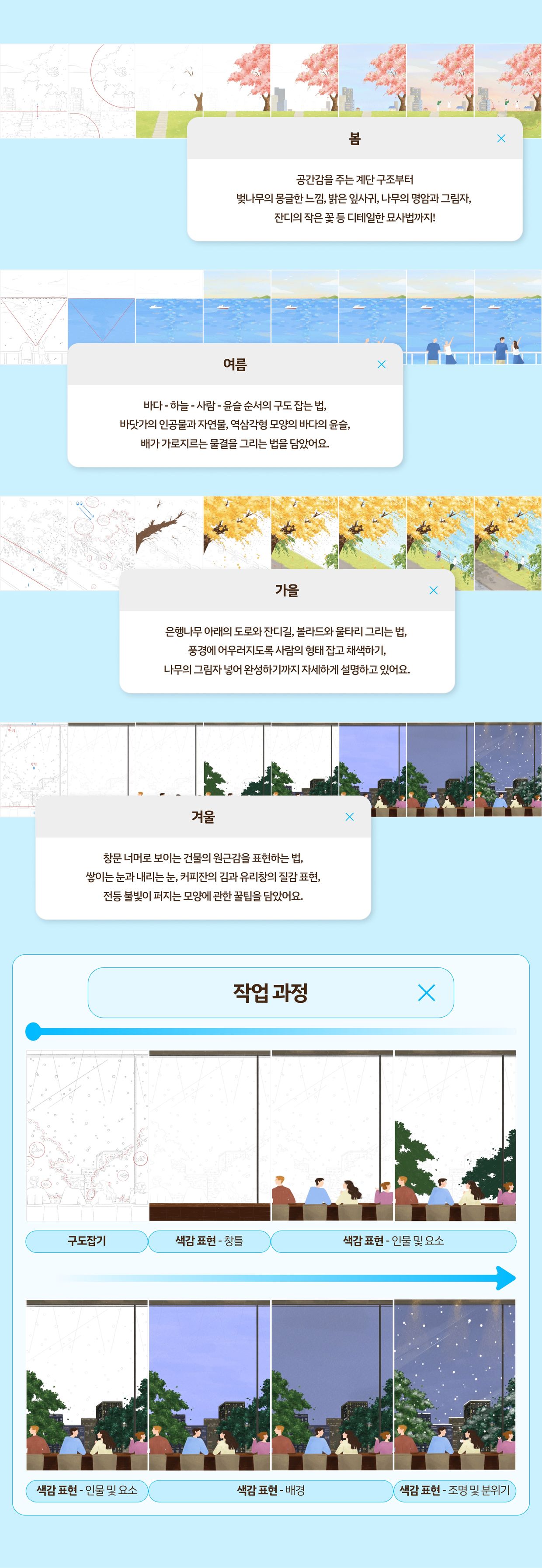 한 폭의 그림을 완성하기 위해서, 더 나아가 한장의 그림으로 외주를 받기 위해서는 풍경 그리기가 필수적입니다. 감성적인 무드의 풍경은 정인 작가의 특징이기도 한데요. 이 부분은 특히 더 자세하게, 단계별로 준비했는데요. 스케치부터 구도까지, 작가의 작업 과정과 그에 따른 팁을 하나씩 따라가며 살펴보실 수 있습니다. 이 과정에서 한 폭의 그림을 완성하기 위한 한끗의 팁을 배워가실 수 있습니다.