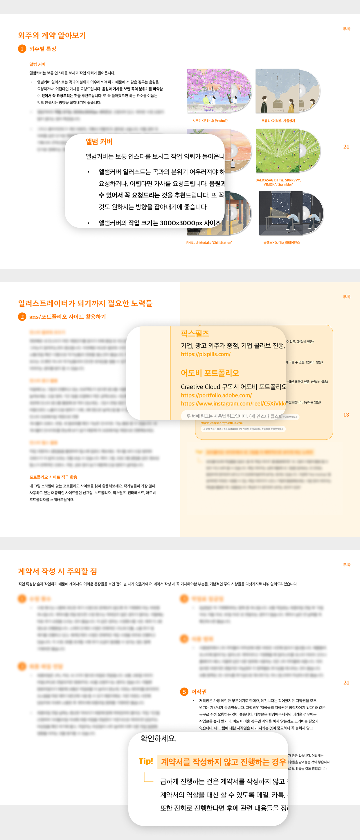 그림을 그리는 방법은 물론, 업계에 나가 활동하기 위한 기초적인 준비도 필요하겠죠. 인스타와 포트폴리오 사이트 활용법, 외주 단가 조율법, 계약서 작성시 주의사항 등등… 초보자라면 접근하기 어려운 정보를 부록으로 구성했습니다.