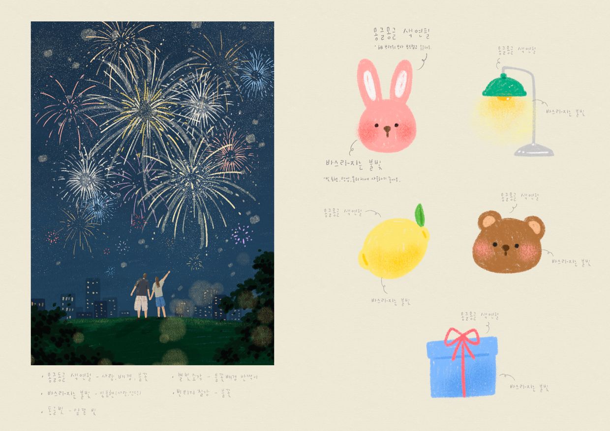 현업 일러스트레이터가 단계별로 그림을 그려가는 과정을 세세하게 살펴볼 수 있는 기회입니다. 이 단계에서 왜 이런 구도를 잡았는지, 어째서 이렇게 색을 칠했는지, 왜 이런 사물이 등장했는지… 밑그림부터 시작하여 채색 단계까지 과정을 상세히 담아냈습니다. 여러번 따라가다보면 그림을 그릴 때 훨씬 수월하다는 느낌이 드실거예요.