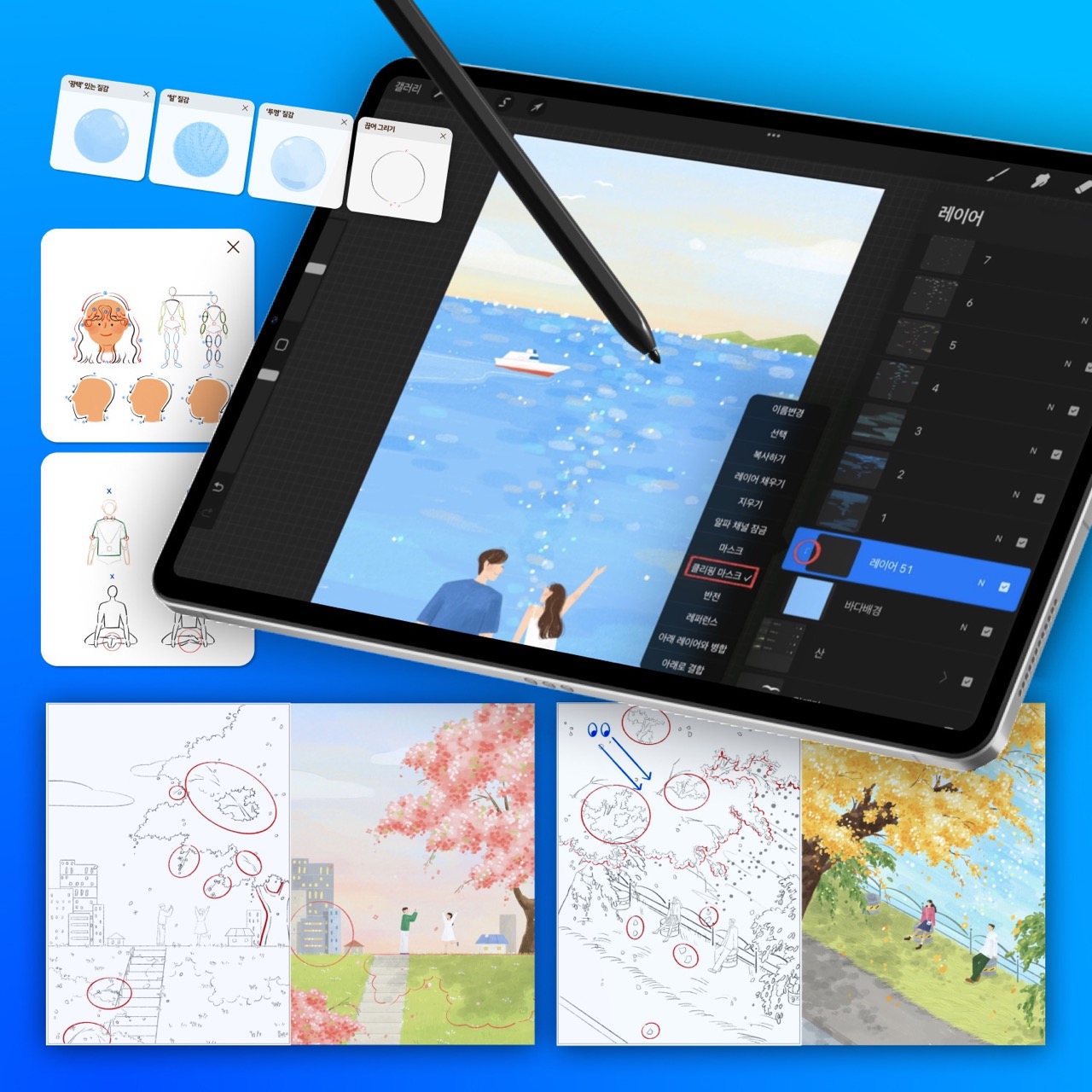기본 브러쉬 추천부터 레이어 나누는 법, 채색 수정 팁까지. 외주별 특징과 계약서 작성시 주의할 점, 담당자와의 소통 방법까지. 현업으로 활동하며 느낀 노하우를 작지만 알차게 담아냈습니다.