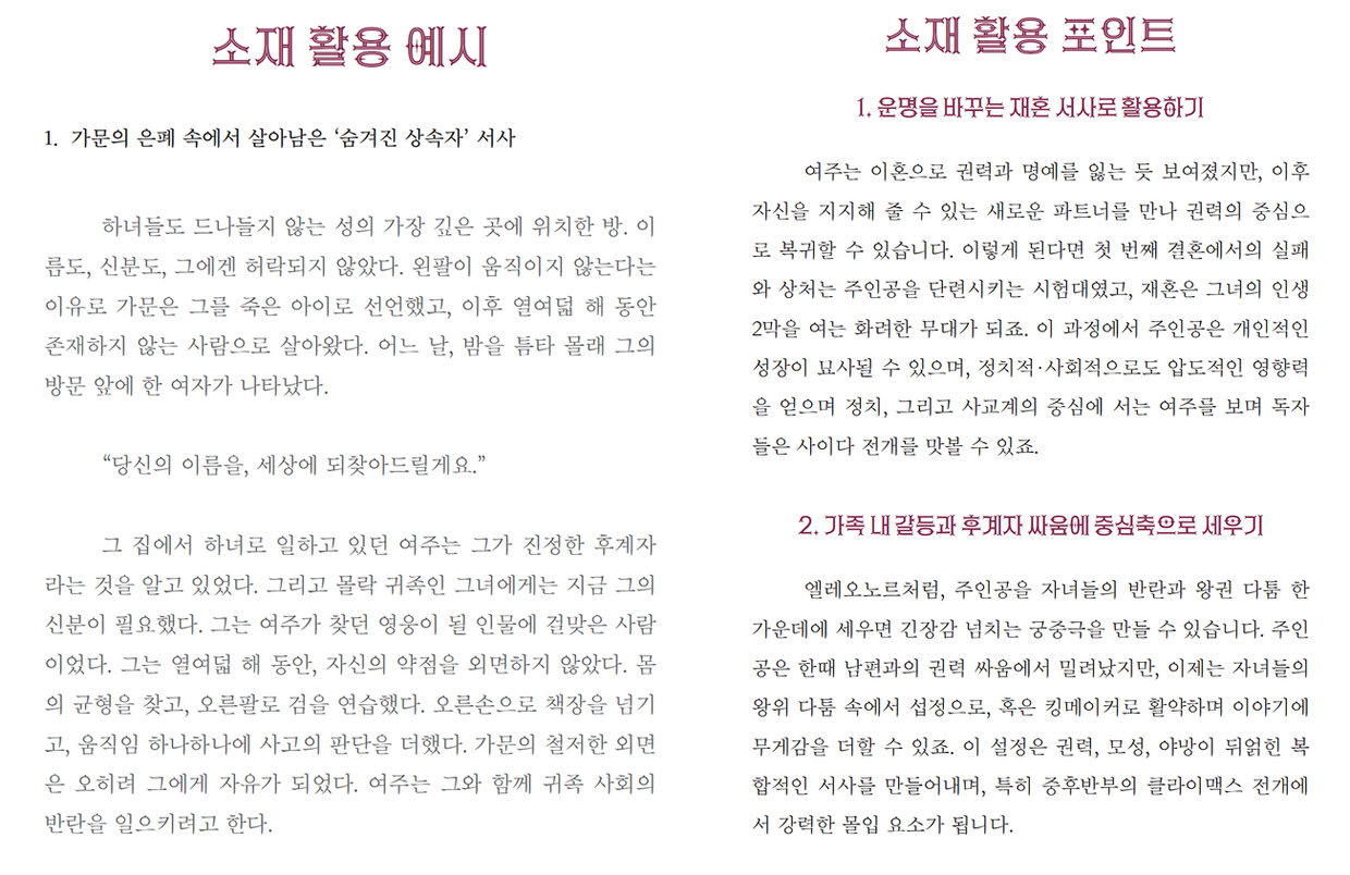 소재 활용 예시와 활용 포인트가 준비되어있어요. 해당 소재를 바탕으로 창작한 로맨스판타지 줄거시/시놉시스나 소재 활용 포인트(구체적인 전개 방식 제안)을 함께 구성했습니다. 당연히 직접 창작해, 이를 바탕으로 웹소설을 작성하셔도 아무런 문제가 없어요.