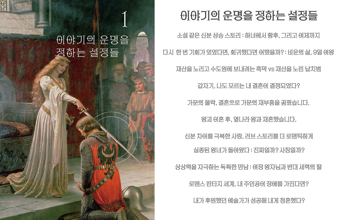 옆 나라 왕과 재혼한 이야기, 원하지 않는 결혼이었지만 사랑에 빠진 이야기, 가문의 부흥과 몰락을 다루는 스토리... 트렌디한 로판의 핵심 설정을 위한 소재를 준비했습니다.