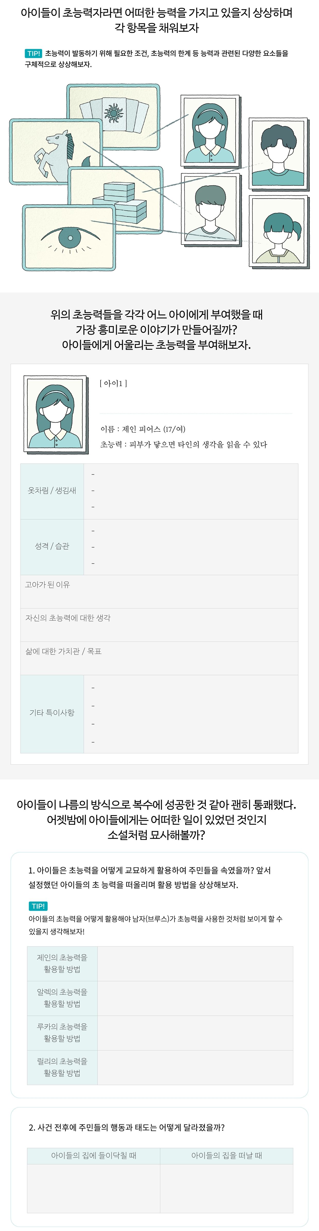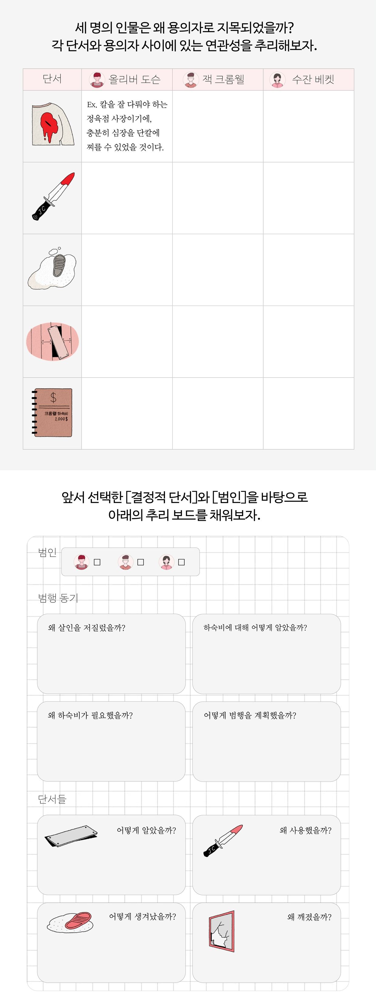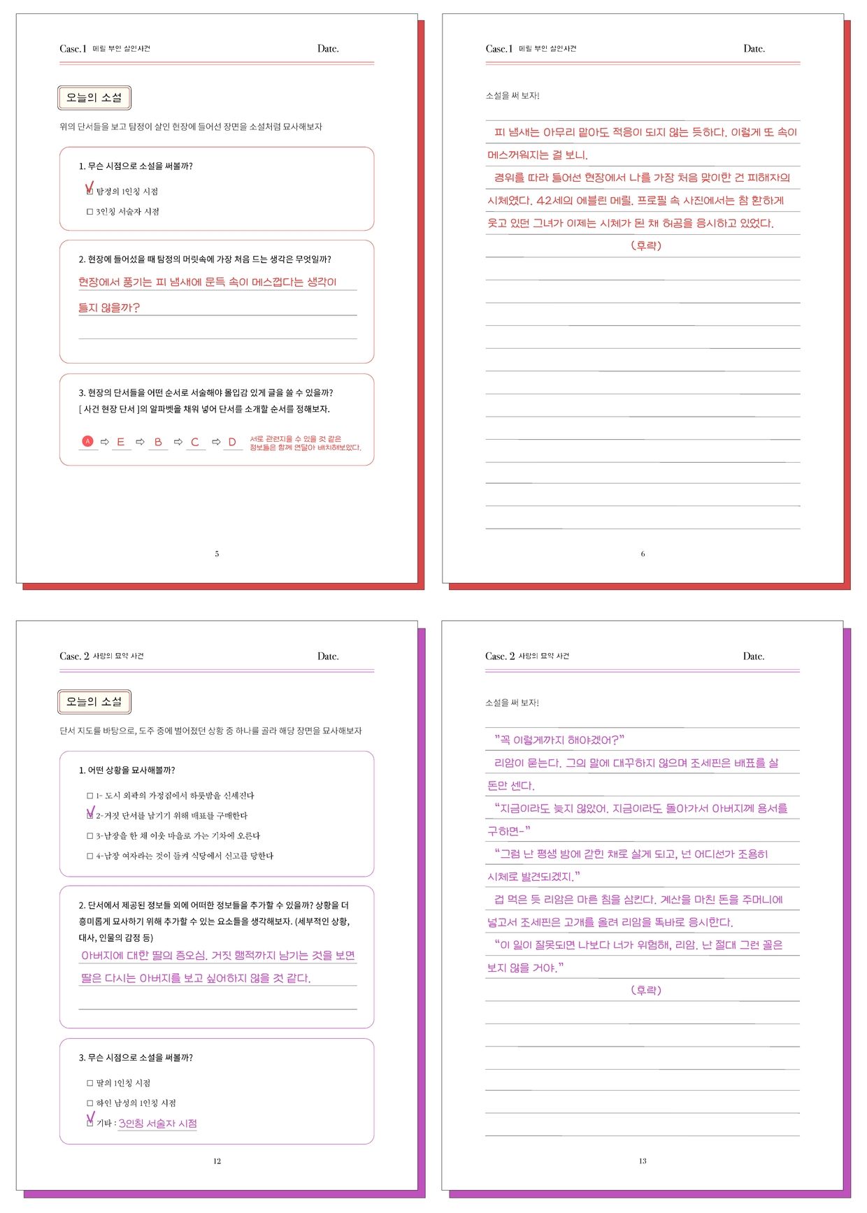 이 수사노트에는 사실 엄청난 전략(!)이 담겨있습니다. 바로, 소설쓰기와 스토리 설계를 위해서는 꼭 거쳐야 하는 탄탄한 지식이 자연스럽게 녹아 있다는 것이죠. 한 권의 책을 따라가면 사건이나 감정 묘사, 플롯 구성, 캐릭터 설계 등을 아주 재미있게 연습할 수 있는데요. 몇가지 예제를 살펴보겠습니다. 단, 아래 페이지는 극히 일부라는 점을 잊지 마세요. 탐정 수사노트는 무려 180페이지에 달하는 든든함을 갖추고 있으니까요.