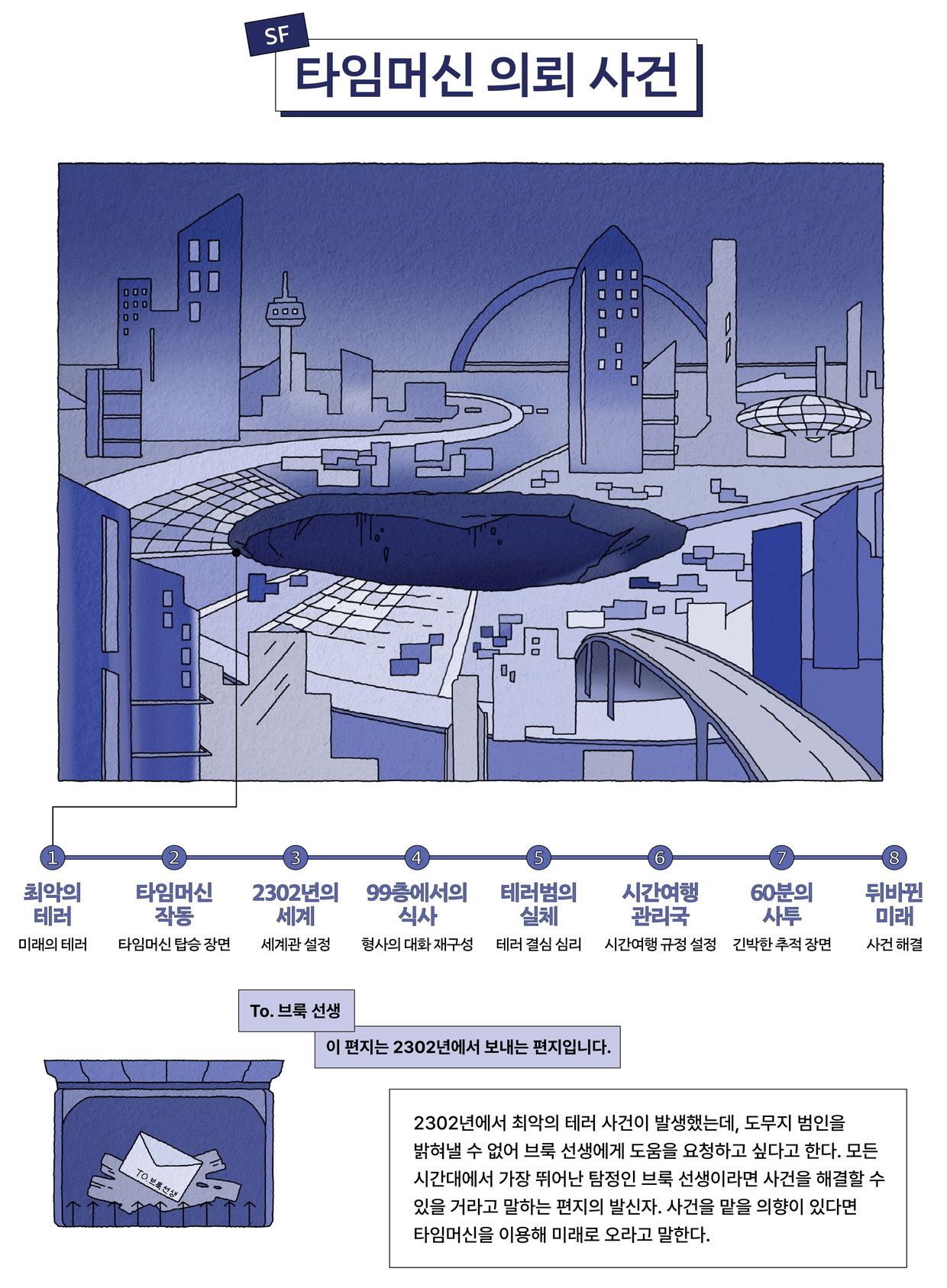 브룩 선생님의 사무실로 의뢰된 사건은 총 6가지. 추리, 로맨스, 판타지, 모험, 스릴러, SF로 나눌 수 있습니다. 여러분이 쓰게 될 소설의 주제를 살펴볼까요?