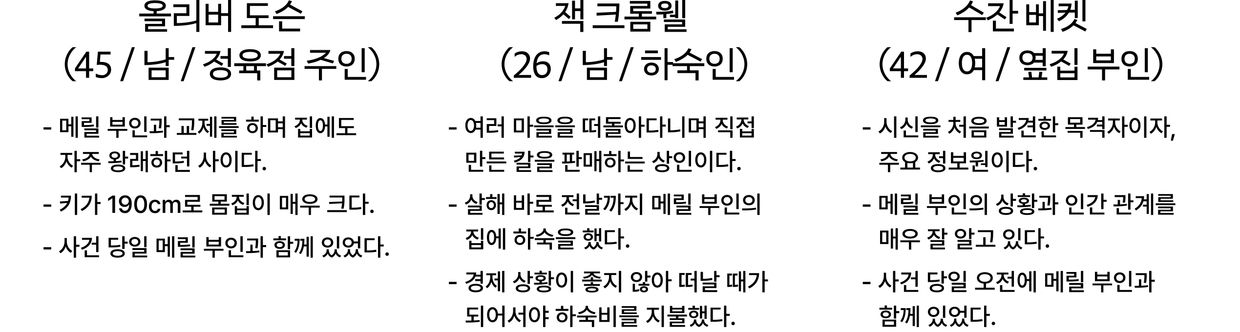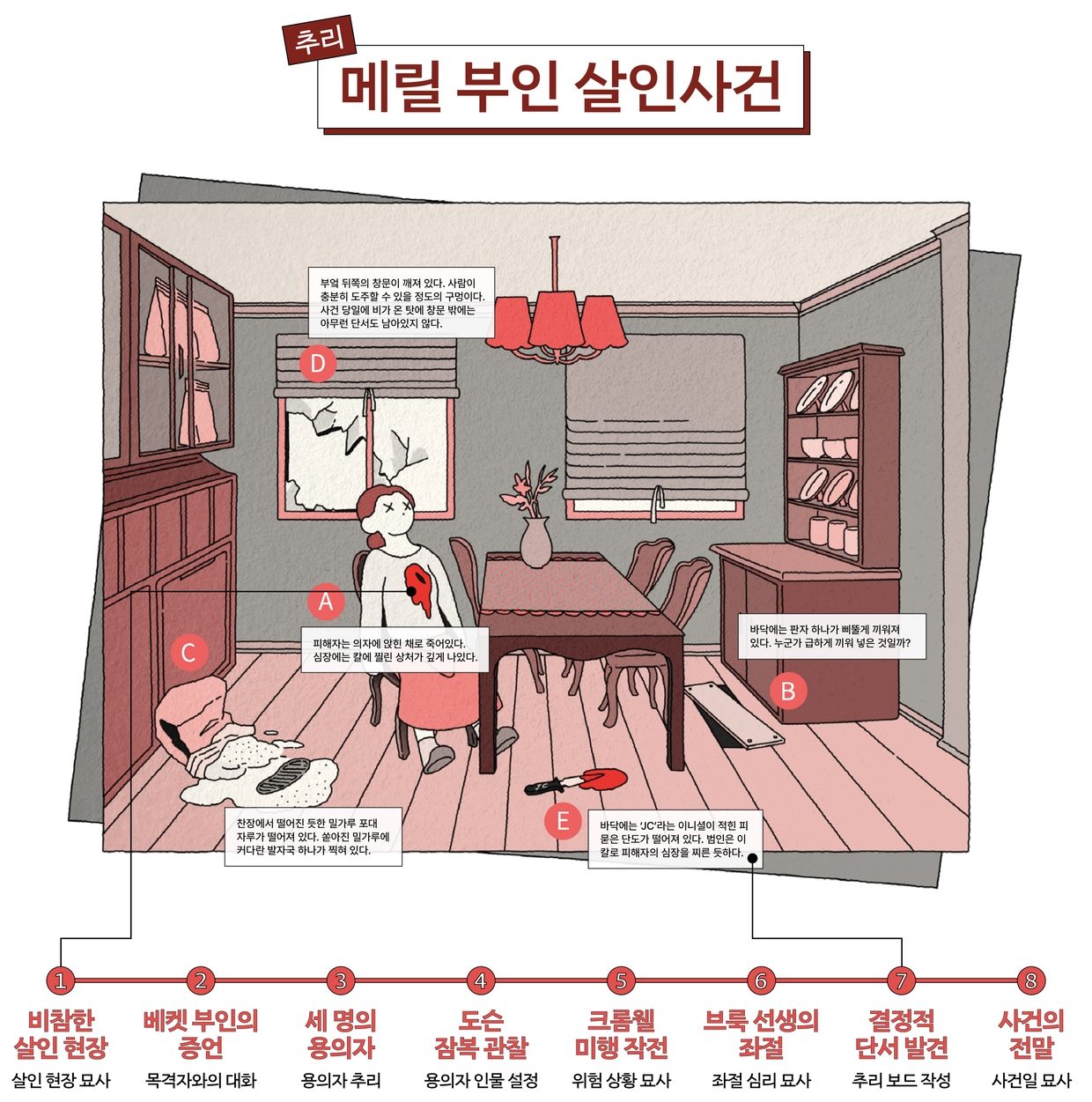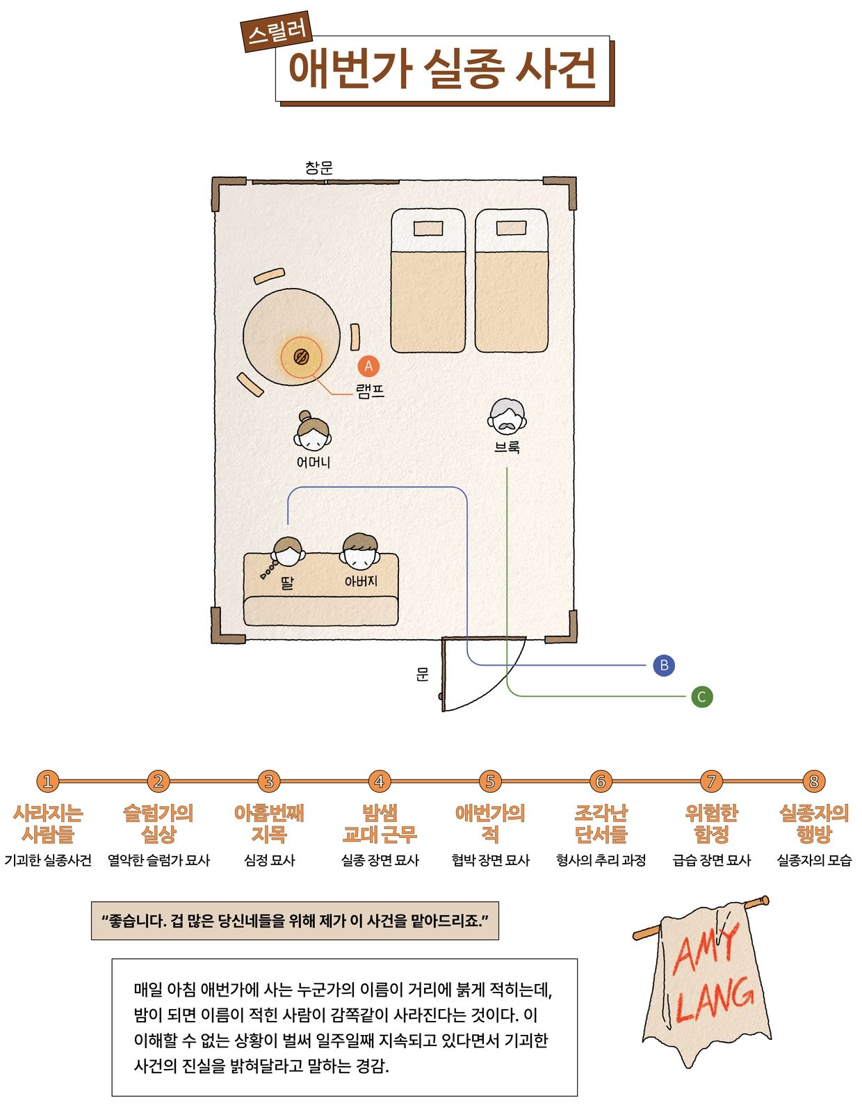 19세기 최고의 탐정, 브룩 선생님의 조수로 일하는 라일리는 사실 글쓰기라는 은밀한 취미를 가지고 있습니다. 브룩 선생님이 가져오는 정보들을 슬쩍 엿본 후 실제 사건처럼 재구성하여 소설을 쓰는 것이죠. 자, 여기 들어오신 여러분은 이제 초보 탐정에 임명되었습니다. 들어올 땐 자유였지만, 나가기 위해서는 사건을 모두 해결해야하죠! 라일리와 함께 단서를 조합하세요. 흥미로운 정보들을 조합해 나만의 소설 6편을 완성할 수 있는 수사노트를 여러분께 공개합니다.