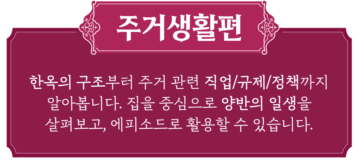 평생도로 엿보는 양반의 일생 / 결혼이 아니라 혼인 / 가사규제: 100칸 집을 짓지 마라 / 한양 집값과 조선의 공인중개사 / 왕도 축하하는 어머니의 생신연 / 아들딸 골고루 나눴던 상속과 제사 / 조상님을 모시는 사당과 재실 / 주인을 닮은 사랑채 / 살림의 중심, 안채 / 줄행랑을 치다, 행랑채 / 부부유별, 가만히 다니는 가막마루 / 반가와 민가를 구분하는 솟을대문 / 부엌살림과 살강 / 후원과 정원을 장식한 취병 / 당호, 집의 이름