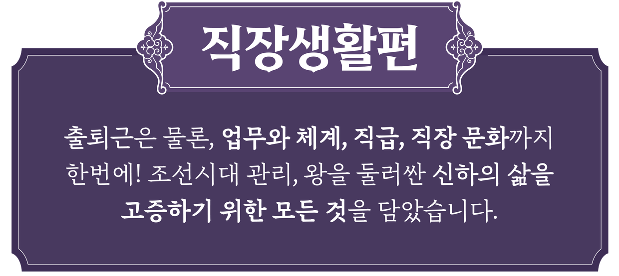 새벽 출근과 배달받는 점심 / 말 타고 가마 타고, 출퇴근길 / 피할 수 없는 신고식 면신례 / 청요직의 상징 홍문관 업무 / 왕의 측근들이 일했던 궐내 각사 / 규장각과 젊은 인재 초계문신들 / 관직과 인사 평가 / 학과 호랑이, 문관과 무관 / 의정부와 육조, 관청의 구조 / 모두가 부러워한 예조의 연못 / 열심히 출근하면 항의받은 공조판서 / 조선의 원로회, 기로소 / 왕의 말을 관리한 사복시 / 죄인을 관리한 전옥서 / 평균 임기 3개월 한성판윤