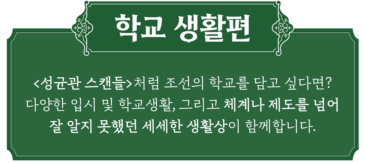 조선의 교육기관들, 서당부터 성균관까지 / 성균관으로 가는 지름길, 4부학당 / 국립대학, 성균관의 공간 구성 / 당파별로 나뉜 동재와 서재 / 성균관 앞 반촌의 비밀 / 세자의 후계수업과 세자시강원 / 과거제도와 아홉번 급제한 이율곡 / 한양 살면 유리했던 비정규시험 별시 / 문과와 무과 응시 / 60세 이상만 보는 과거 / 급제자의 특권 삼일유가 / 응시생 10만명 찾아온 인구 30만 한양 / 과거시험장이 된 경복궁과 육조거리 / 관학 향교와 사학 서원 / 동방오현과 5대서원