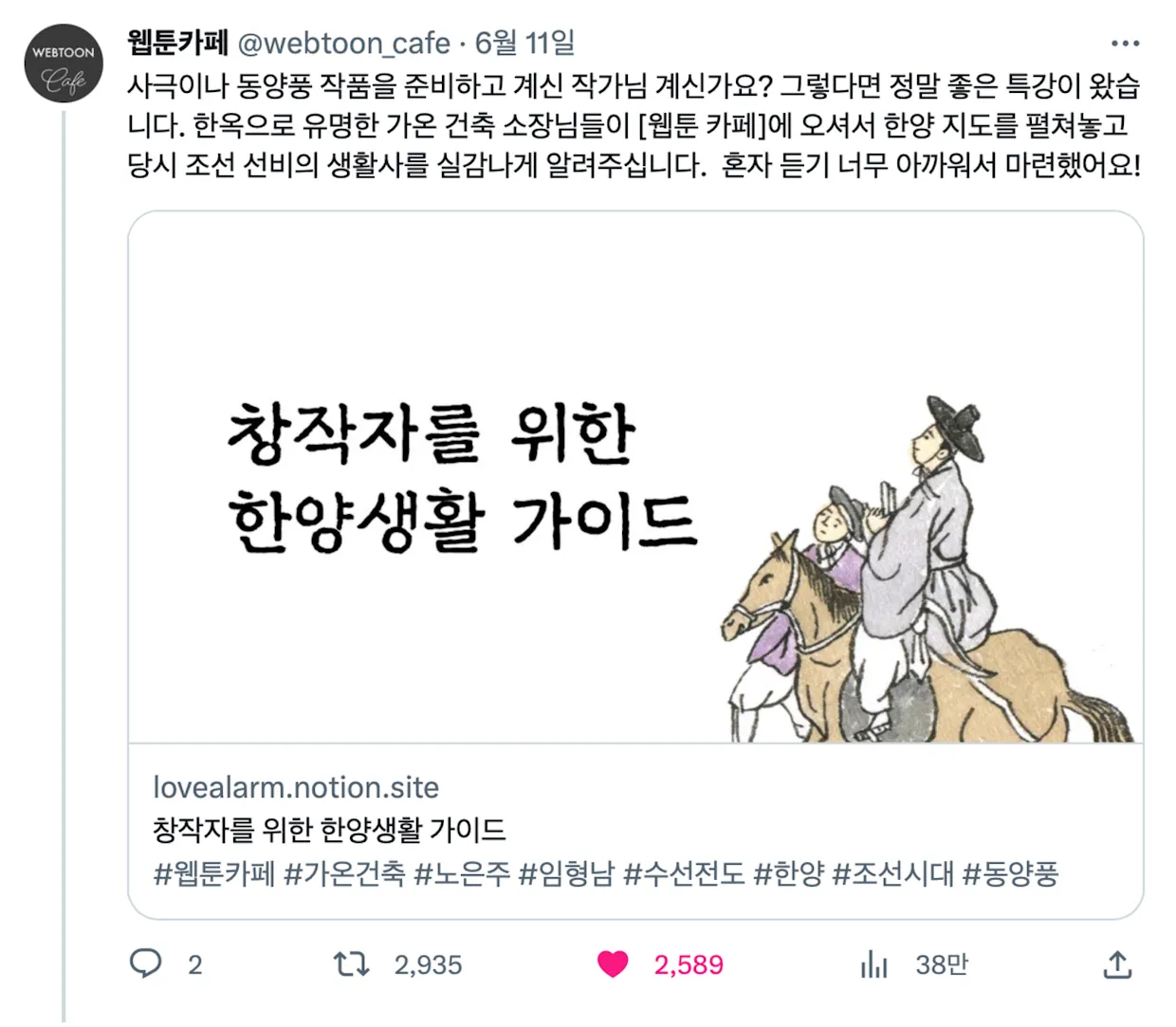2️⃣ 창작자에게 가장 최적화된, 검증된 콘텐츠입니다. <창작자를 위한 한양생활 가이드>는 웹툰카페에서 현업 작가님들께 큰 호응을 받은 강연을 기반으로 제작됩니다.