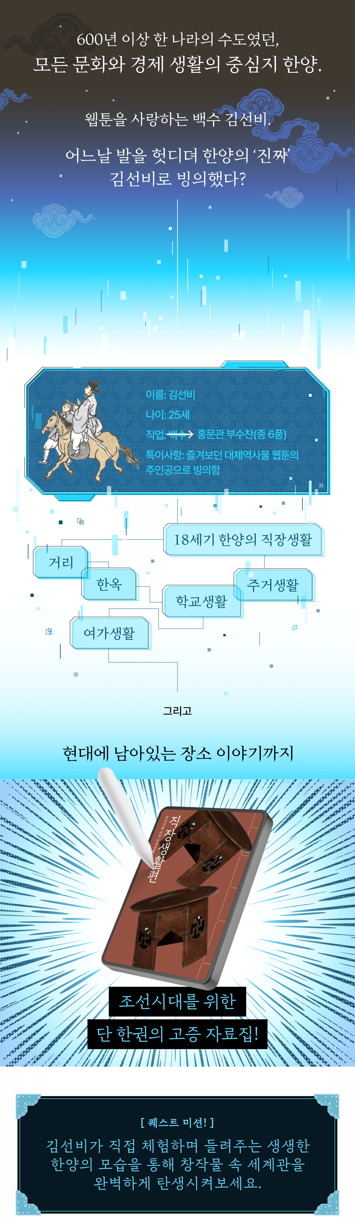 웹툰카페에서 창작자분들께 강연했던 <김선비의 한양생활 가이드>의 내용과 임형남 건축가가 다시 그린 김정호 선생님의 <청구도-도성전도>(1834)를 따라 200년 전 한양을 함께 걸어볼 예정입니다. 규장각, 도화서, 육조거리, 피맛길 등 우리가 영화나 드라마에서 보았거나 책에서 읽었던 한양의 공간들을 입체적으로 만나보며, 과거와 현재의 시간이 교차되는 상상을 공유해 볼까 합니다.