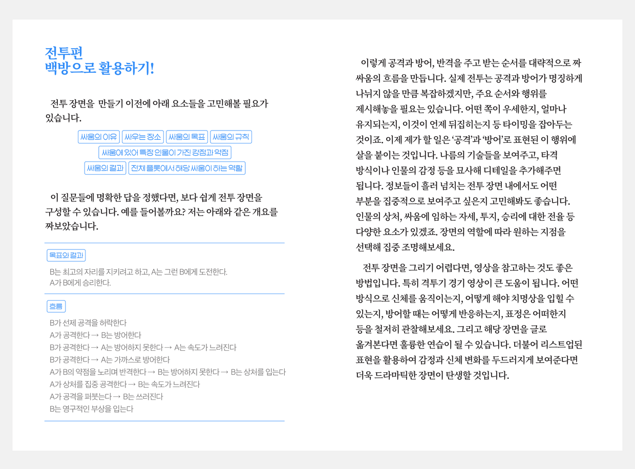 <백방으로 활용하기!> 파트에는 해당 장르의 성격과 특성, 장르에서 제시되는 상황의 활용법 등이 제시됩니다. 단어 리스트 활용과 구성을 위한 작가의 꿀팁을 소개해주는 파트입니다.