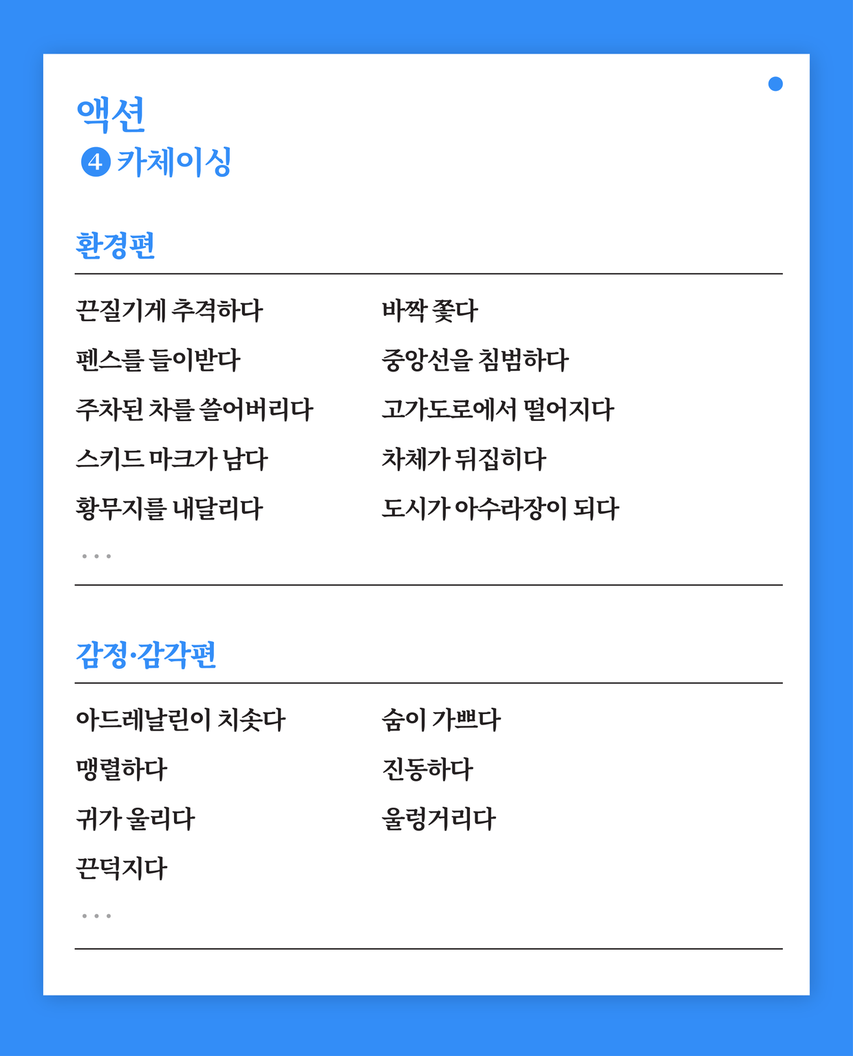 해당 가이드와 단어 리스트는 해당 섹션에 맞는 범용적인 단어들로 구성했어요. 요즘은 여러 장르의 요소들을 함께 쓰는게 트렌드이기도 합니다. 로맨스 장르지만 스릴러를 통해 긴장감을 불어넣고, 그 과정에서 액션씬이 등장할 수 있는 것 처럼요! 꼭 해당 장르의 작가가 아니라도 작품 속 특정 상황이나 장면에서, 이번 프로젝트의 단어를 알차게 활용해보세요!