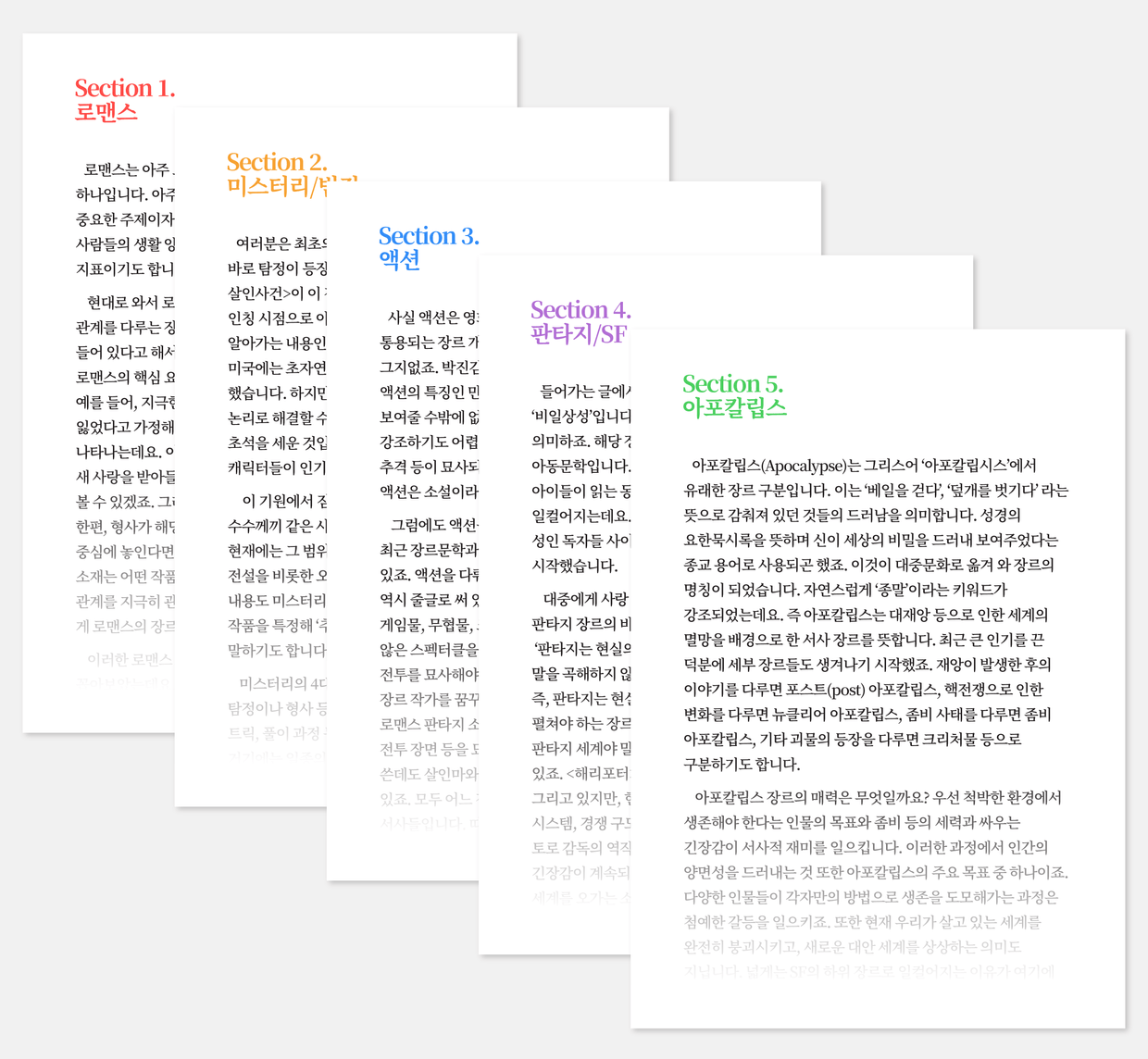 5가지 장르(분야)에 대한 간단한 작가의 설명이 함께합니다. 2-3문단 정도로 이루어진 설명을 통해 해당 장르에 대한 전반적 지식을 익힐 수 있습니다.