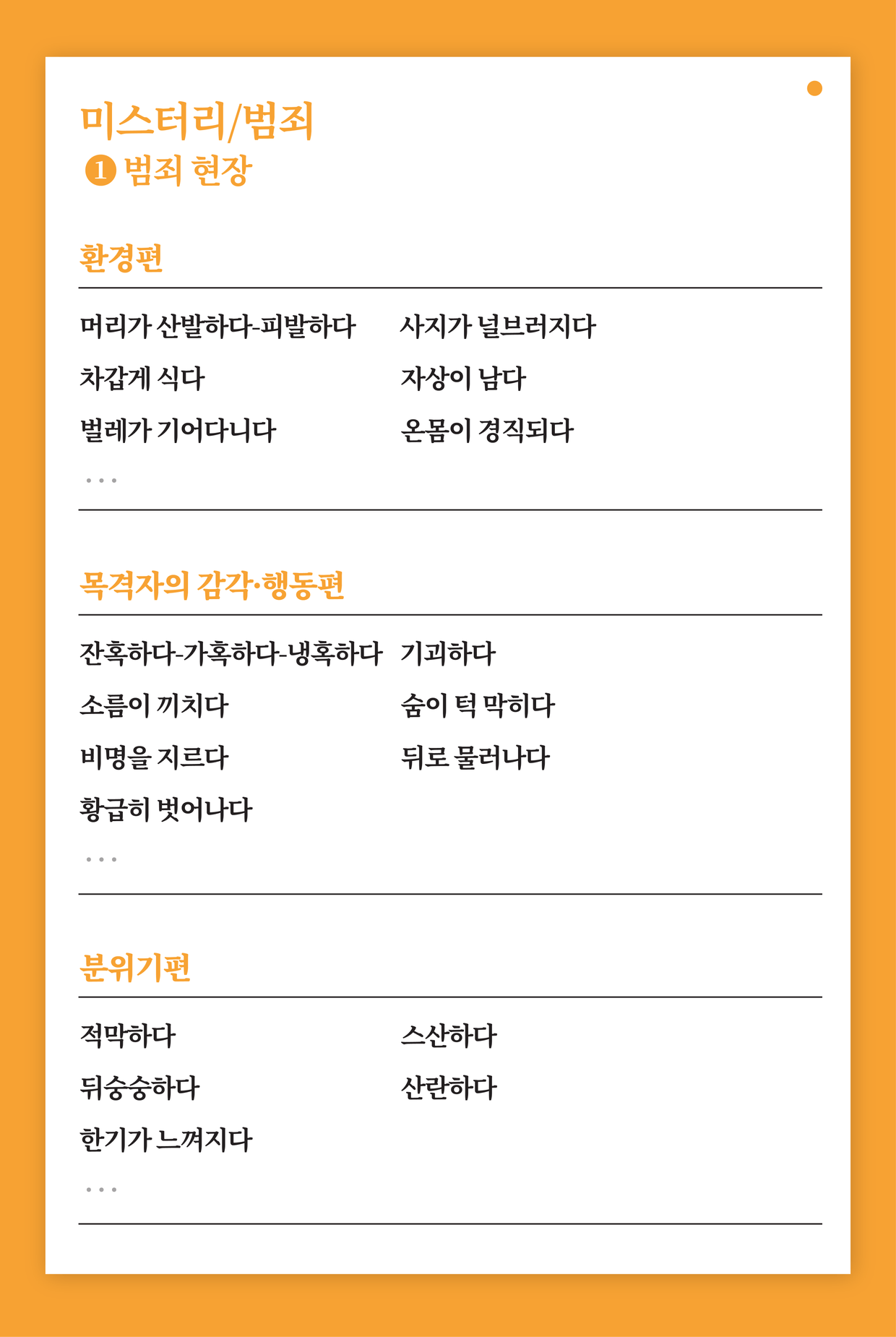 범죄 현장은 인물의 감정도 중요하지만, 배경 설명도 핵심적이지요.🥷 분위기와 환경을 작가가 쉽게 표현할 수 있도록 돕는 단어도 함께합니다.