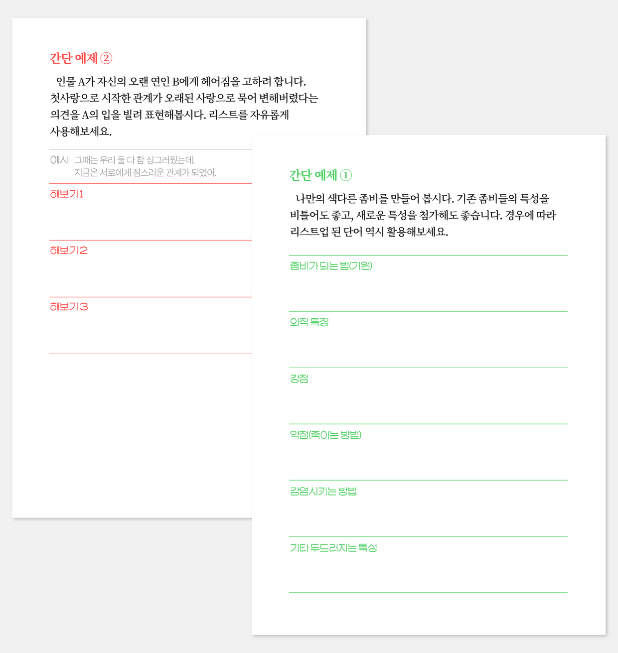 단어리스트를 더 잘 활용할 수 있도록, 장르 가이드북을 함께 구성했습니다. 60페이지로 구성된 미니 가이드북과 함께, 제시된 단어를 요리조리 사용해보세요!
