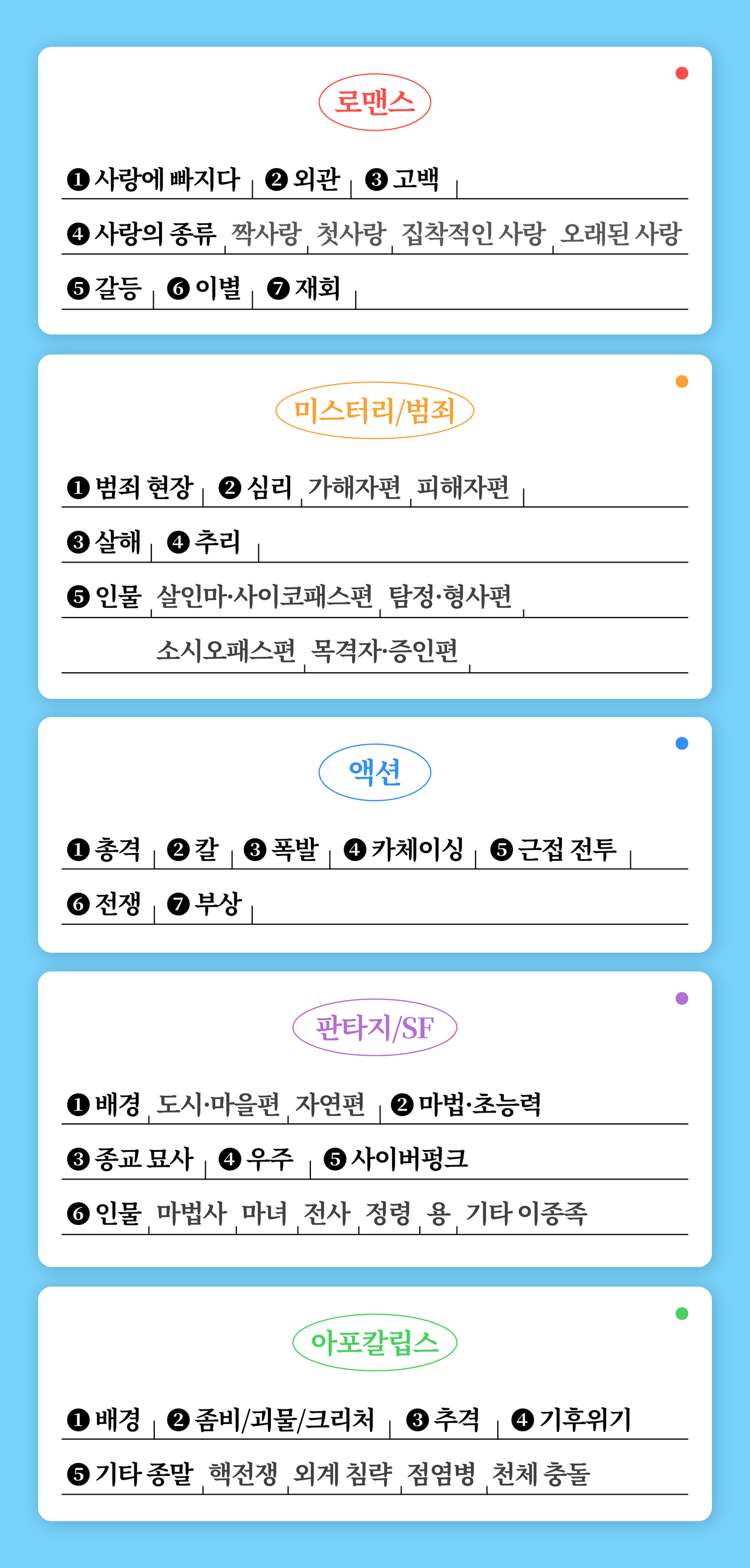 각종 작품에서 꼭 필요한 장면들이 무엇이 있을까? 모든 창작물에 등장하는 ‘로맨스’부터, 극 중 긴장감을 불러일으킬 미스터리와 범죄, 최근 유행하는 아포칼립스와 판타지, 액션까지. 5가지 장르로 세분화하여 준비했습니다.