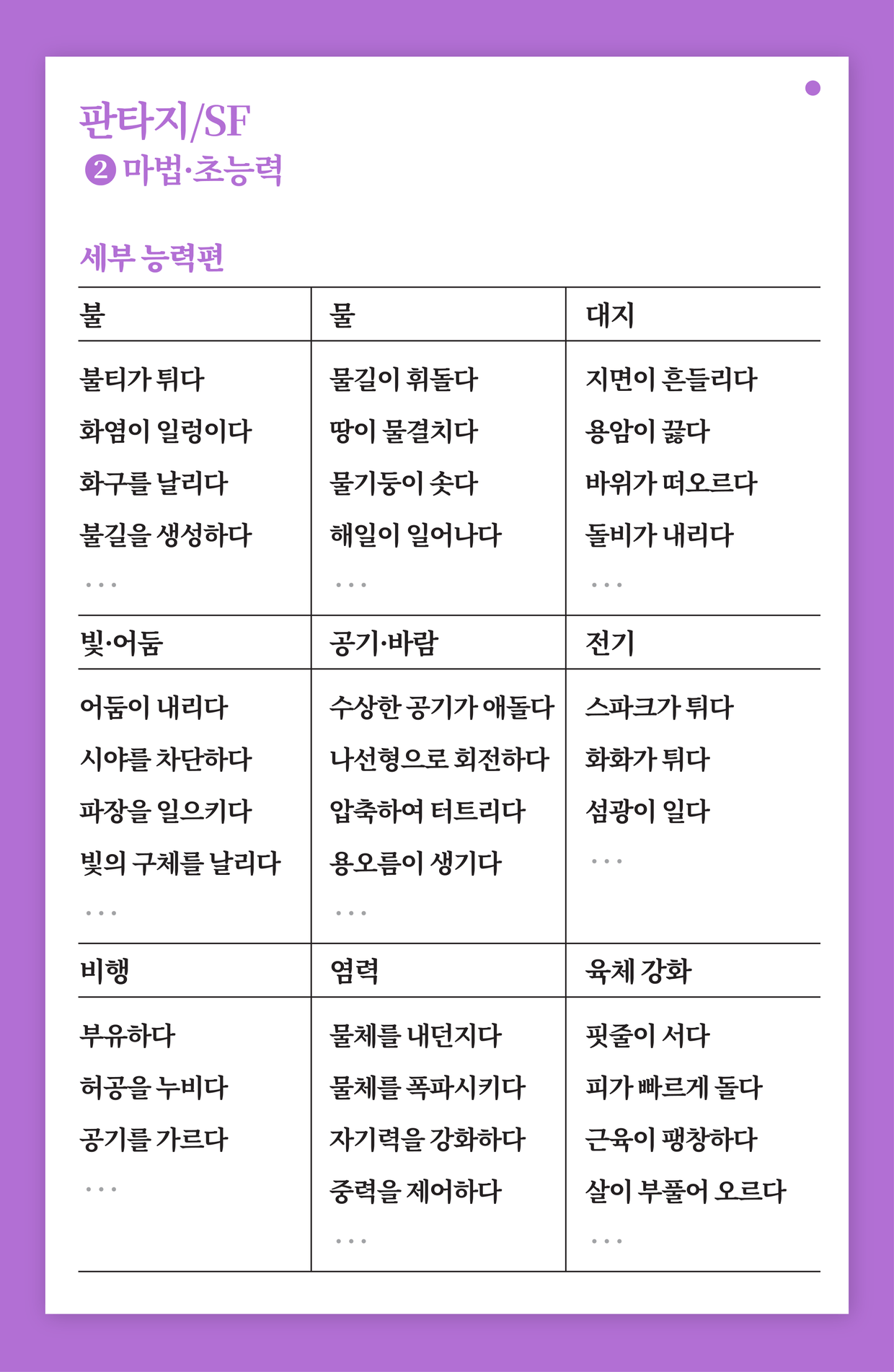 SF의 마법, 초능력 파트도 함께 살펴볼까요?🧙♀ '초능력과 관련된 용어'가 한번에 모아져있으면 찾기가 참 어렵지요. 속성별로 분류해 캐릭터에게 딱 맞는 단어를 선택하기 쉽습니다.