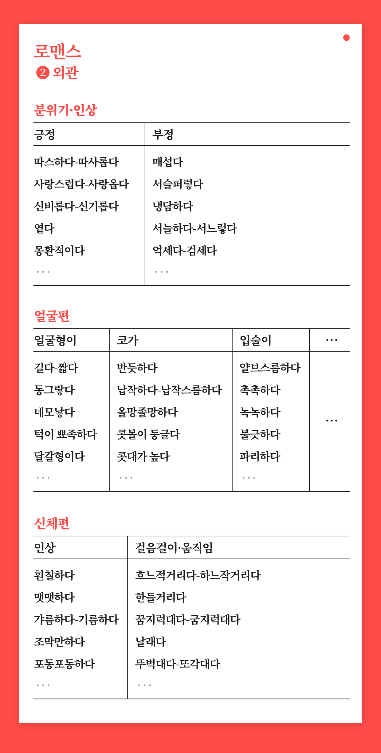 로맨스의 외관 단어 리스트 파트입니다.😎 분위기와 인상 / 얼굴 / 신체로 나누어 외관을 구체적으로 설명할 수 있도록 구성했어요. 이 안에서도 긍정과 부정, 구체적인 얼굴의 부위, 인상과 움직임 등으로 카테고리를 나누어 바로 골라쓸 수 있도록 나열했습니다.