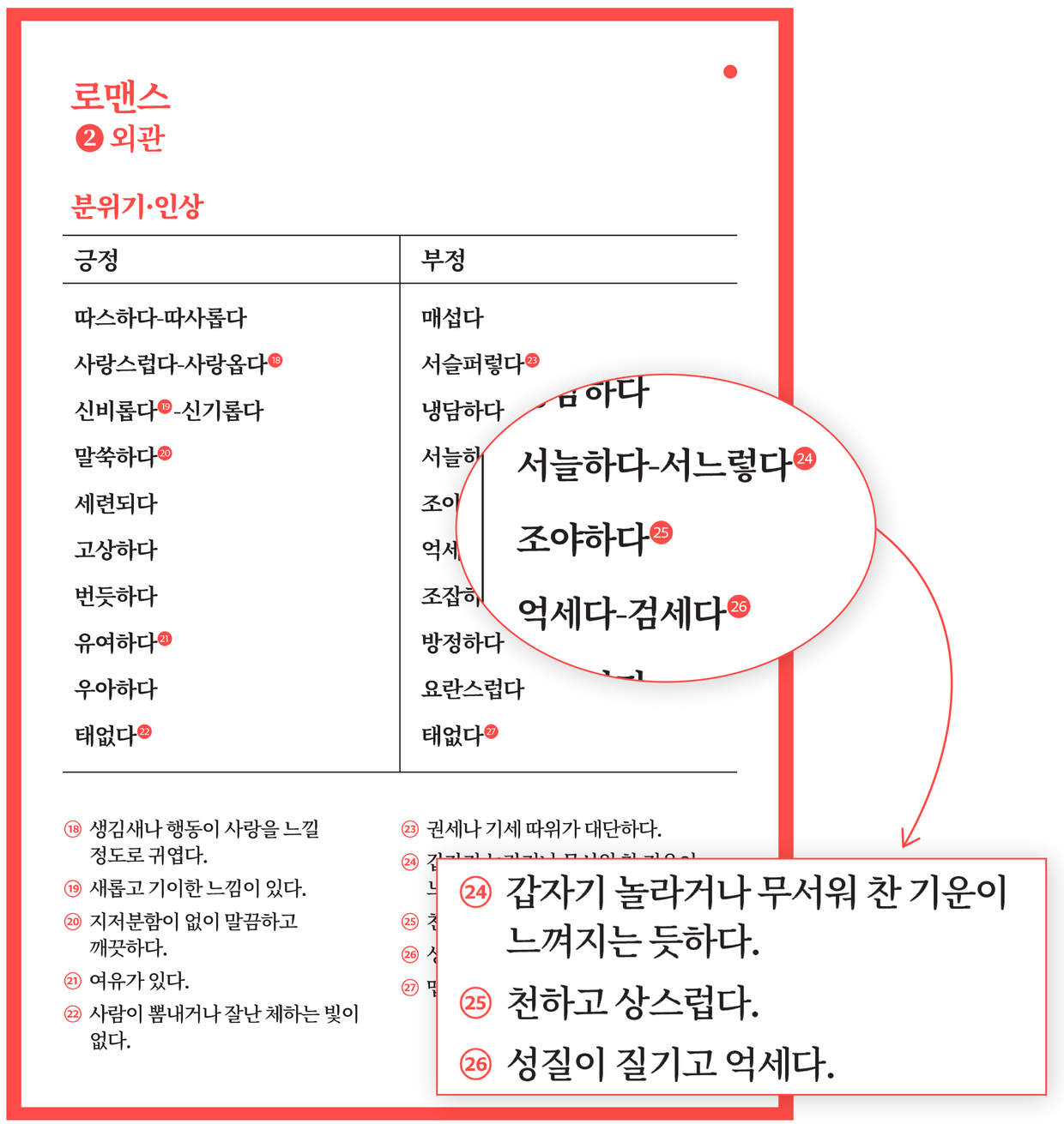 위에서 살펴본 목차 내에서도 상황과 감정, 신체의 부위, 환경과 행동 등으로 세분화하여 디테일하게 구성했습니다. 총 2000개가 넘는 단어를 수록했어요. 한번 살펴볼까요?