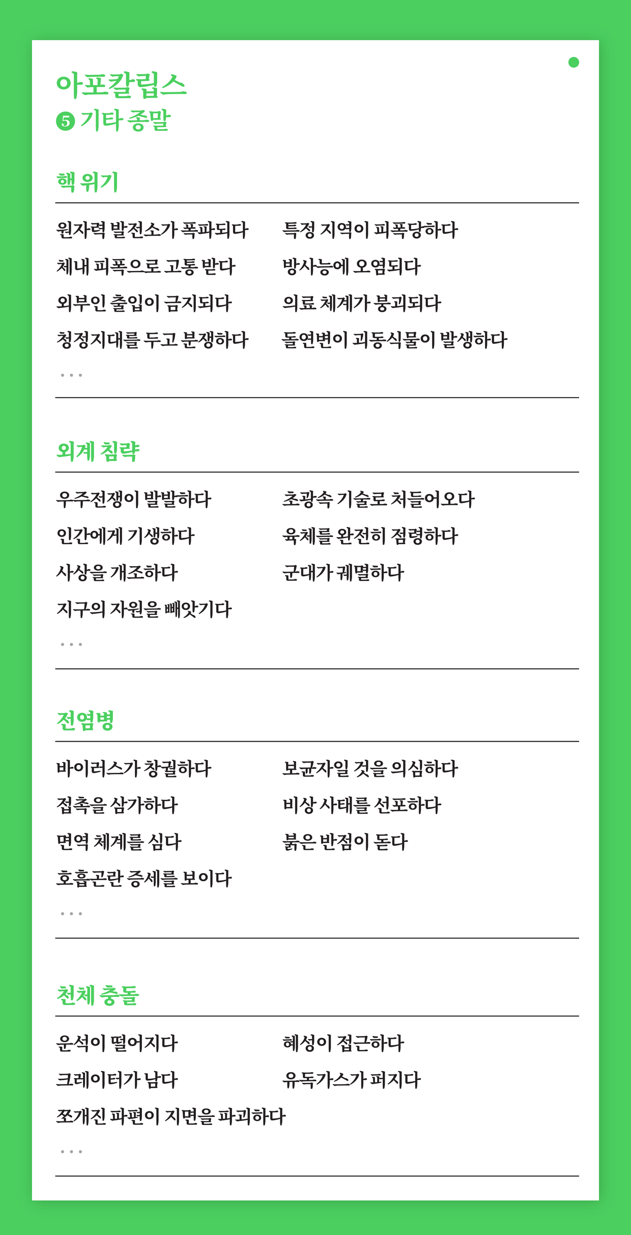 아포칼립스의 기타종말 파트입니다. 종말의 원인을 어떻게 설정할지에 대한 아이디어를 얻을 수도 있겠죠?🪐